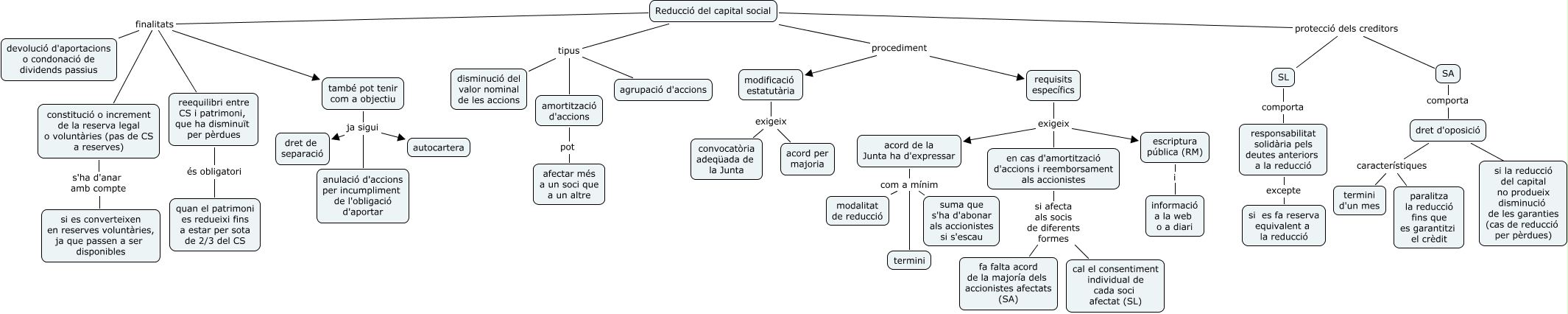 Este Cmap, tiene información relacionada con: mapa 10, acord de la Junta ha d'expressar com a mínim termini, Reducció del capital social tipus disminució del valor nominal de les accions, requisits específics exigeix en cas d'amortització d'accions i reemborsament als accionistes, constitució o increment de la reserva legal o voluntàries (pas de CS a reserves) s'ha d'anar amb compte si es converteixen en reserves voluntàries, ja que passen a ser disponibles, Reducció del capital social tipus amortització d'accions, escriptura pública (RM) i informació a la web o a diari, Reducció del capital social tipus agrupació d'accions, en cas d'amortització d'accions i reemborsament als accionistes si afecta als socis de diferents formes fa falta acord de la majoría dels accionistes afectats (SA), Reducció del capital social finalitats també pot tenir com a objectiu, amortització d'accions pot afectar més a un soci que a un altre, Reducció del capital social procediment modificació estatutària, SL comporta responsabilitat solidària pels deutes anteriors a la reducció, acord de la Junta ha d'expressar com a mínim suma que s'ha d'abonar als accionistes si s'escau, requisits específics exigeix acord de la Junta ha d'expressar, dret d'oposició característiques termini d'un mes, responsabilitat solidària pels deutes anteriors a la reducció excepte si es fa reserva equivalent a la reducció, Reducció del capital social finalitats devolució d'aportacions o condonació de dividends passius, dret d'oposició característiques paralitza la reducció fins que es garantitzi el crèdit, Reducció del capital social procediment requisits específics, Reducció del capital social protecció dels creditors SL