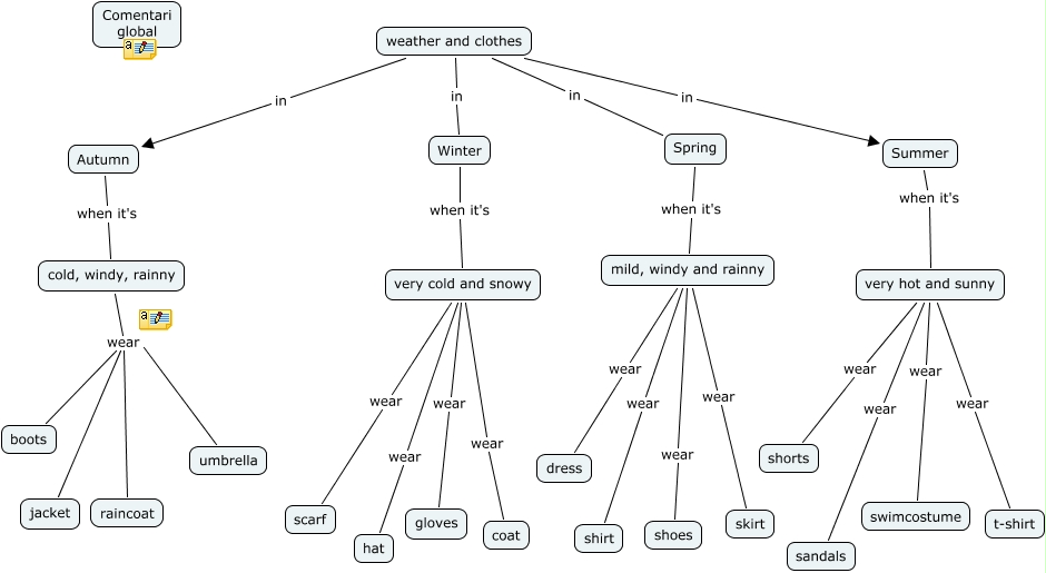 Aquest mapa conceptual conté informació relacionada amb: weather and clothes primary, Spring when it's mild, windy and rainny, weather and clothes in Summer, very hot and sunny wear sandals, cold, windy, rainny wear raincoat, very hot and sunny wear swimcostume, Winter when it's very cold and snowy, cold, windy, rainny wear jacket, very hot and sunny wear t-shirt, cold, windy, rainny wear boots, weather and clothes in Autumn, mild, windy and rainny wear skirt, mild, windy and rainny wear shoes, Summer when it's very hot and sunny, very cold and snowy wear coat, weather and clothes in Winter, cold, windy, rainny wear umbrella, weather and clothes in Spring, mild, windy and rainny wear dress, very cold and snowy wear gloves, very cold and snowy wear hat