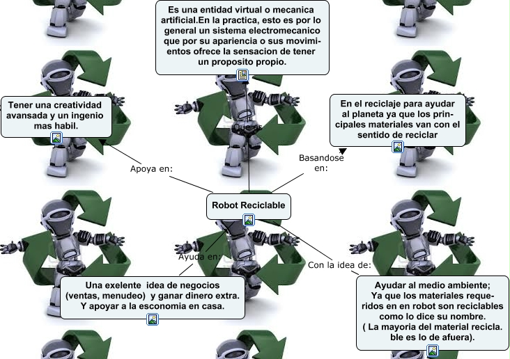 This Concept Map, created with IHMC CmapTools, has information related to: robot reciclado, Robot Reciclable Ayuda en: Una exelente idea de negocios (ventas, menudeo) y ganar dinero extra. Y apoyar a la esconomia en casa., Robot Reciclable Que es Es una entidad virtual o mecanica artificial.En la practica, esto es por lo general un sistema electromecanico que por su apariencia o sus movimi- entos ofrece la sensacion de tener un proposito propio., Robot Reciclable Con la idea de: Ayudar al medio ambiente; Ya que los materiales reque- ridos en en robot son reciclables como lo dice su nombre. ( La mayoria del material recicla. ble es lo de afuera)., Robot Reciclable Basandose en: En el reciclaje para ayudar al planeta ya que los prin- cipales materiales van con el sentido de reciclar, Robot Reciclable Apoya en: Tener una creatividad avansada y un ingenio mas habil.