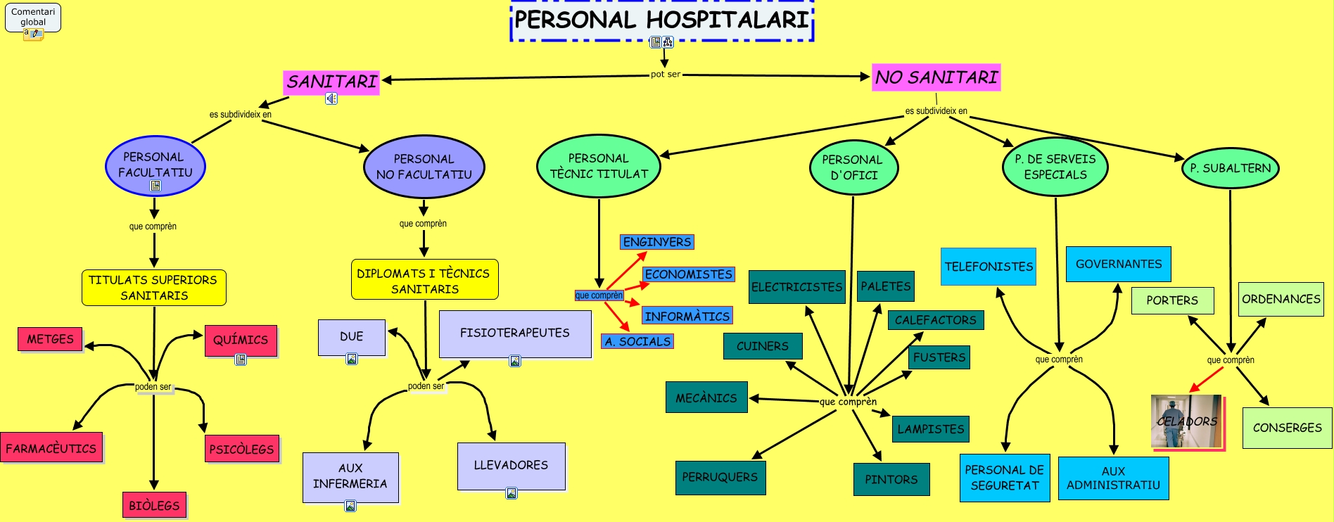 Aquest mapa conceptual conté informació relacionada amb: ACTIVITAT 5, PERSONAL TÈCNIC TITULAT que comprèn ECONOMISTES, PERSONAL TÈCNIC TITULAT que comprèn INFORMÀTICS, DIPLOMATS I TÈCNICS SANITARIS poden ser AUX INFERMERIA, NO SANITARI es subdivideix en P. SUBALTERN, P. SUBALTERN que comprèn CONSERGES, TITULATS SUPERIORS SANITARIS poden ser FARMACÈUTICS, NO SANITARI es subdivideix en P. DE SERVEIS ESPECIALS, PERSONAL D'OFICI que comprèn PERRUQUERS, PERSONAL NO FACULTATIU que comprèn DIPLOMATS I TÈCNICS SANITARIS, TITULATS SUPERIORS SANITARIS poden ser QUÍMICS, NO SANITARI es subdivideix en PERSONAL TÈCNIC TITULAT, P. DE SERVEIS ESPECIALS que comprèn TELEFONISTES, TITULATS SUPERIORS SANITARIS poden ser BIÒLEGS, P. SUBALTERN que comprèn PORTERS, P. DE SERVEIS ESPECIALS que comprèn GOVERNANTES, PERSONAL D'OFICI que comprèn CALEFACTORS, PERSONAL HOSPITALARI pot ser NO SANITARI, PERSONAL FACULTATIU es subdivideix en PERSONAL NO FACULTATIU, TITULATS SUPERIORS SANITARIS poden ser PSICÒLEGS, PERSONAL TÈCNIC TITULAT que comprèn A. SOCIALS