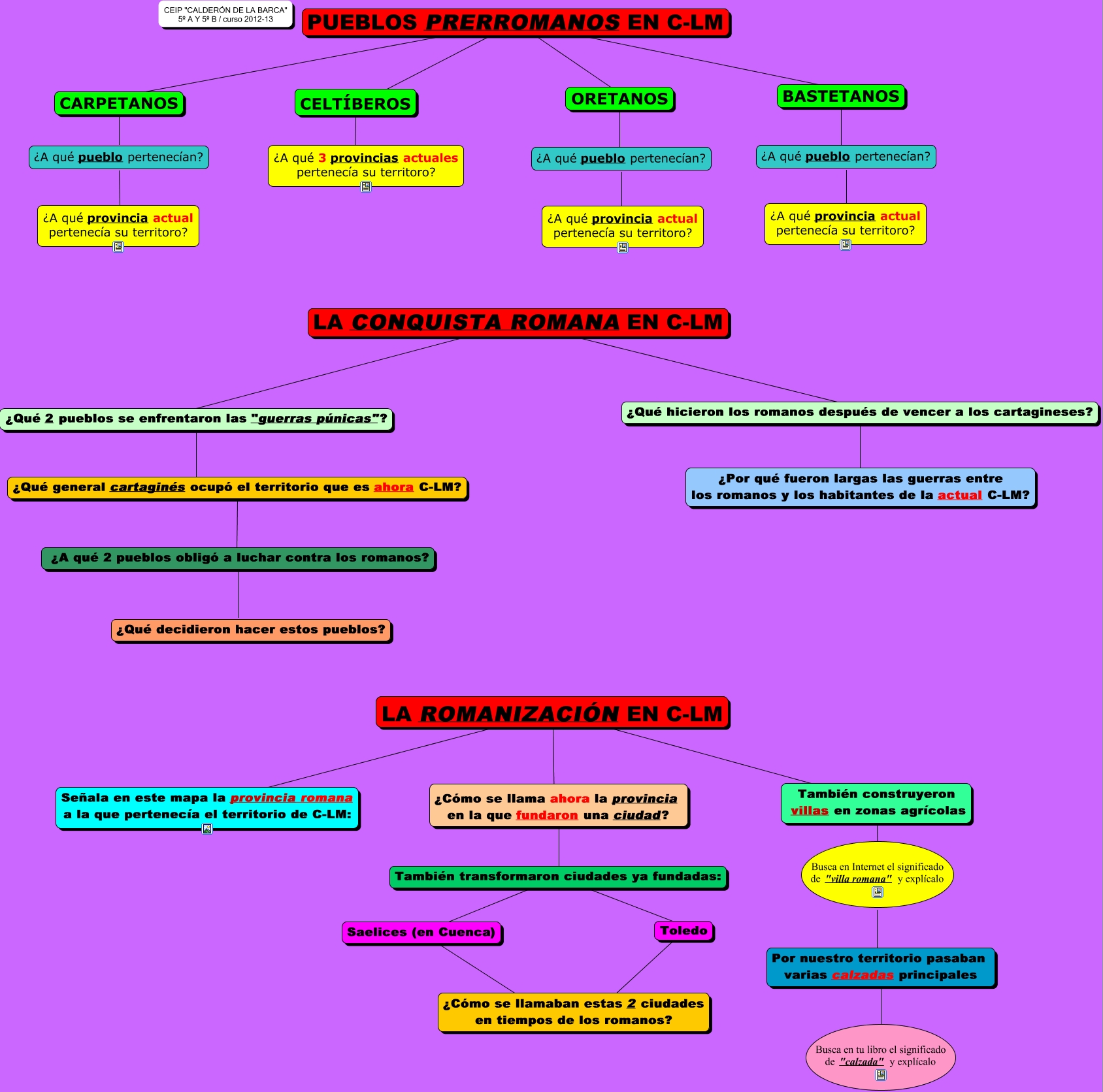 Este Cmap, tiene información relacionada con: LA EDAD ANTIGUA EN CASTILLA-LA MANCHA, PUEBLOS PRERROMANOS EN C-LM ???? CELTÍBEROS, PUEBLOS PRERROMANOS EN C-LM ???? CARPETANOS, LA ROMANIZACIÓN EN C-LM ???? También construyeron villas en zonas agrícolas, Busca en Internet el significado de "villa romana" y explícalo ???? Por nuestro territorio pasaban varias calzadas principales, PUEBLOS PRERROMANOS EN C-LM ???? BASTETANOS, CELTÍBEROS ???? ¿A qué 3 provincias actuales pertenecía su territoro?, ¿A qué pueblo pertenecían? ???? ¿A qué provincia actual pertenecía su territoro?, También transformaron ciudades ya fundadas: ???? Saelices (en Cuenca), PUEBLOS PRERROMANOS EN C-LM ???? ORETANOS, BASTETANOS ???? ¿A qué pueblo pertenecían?, También transformaron ciudades ya fundadas: ???? Toledo, ORETANOS ???? ¿A qué pueblo pertenecían?, Toledo ???? ????, También construyeron villas en zonas agrícolas ???? Busca en Internet el significado de "villa romana" y explícalo, ¿A qué pueblo pertenecían? ???? ¿A qué provincia actual pertenecía su territoro?, LA ROMANIZACIÓN EN C-LM ???? ¿Cómo se llama ahora la provincia en la que fundaron una ciudad?, Saelices (en Cuenca) ???? ¿Cómo se llamaban estas 2 ciudades en tiempos de los romanos?, LA CONQUISTA ROMANA EN C-LM ???? ¿Qué 2 pueblos se enfrentaron las "guerras púnicas"?, LA CONQUISTA ROMANA EN C-LM ???? ¿Qué hicieron los romanos después de vencer a los cartagineses?, Por nuestro territorio pasaban varias calzadas principales ???? Busca en tu libro el significado de "calzada" y explícalo