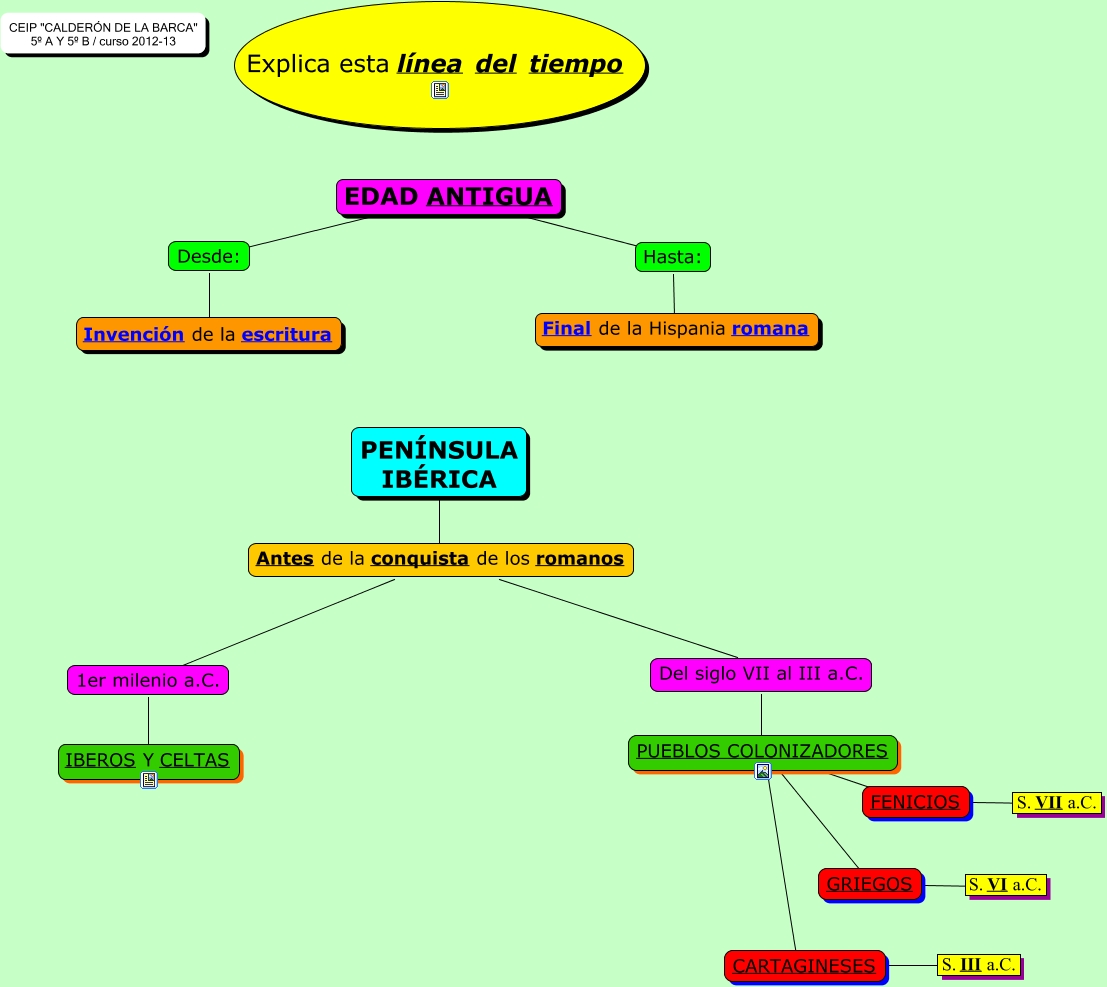 Este Cmap, tiene información relacionada con: LÍNEA DEL TIEMPO - EDAD ANTIGUA, GRIEGOS ???? S. VI a.C., Del siglo VII al III a.C. ???? PUEBLOS COLONIZADORES, PUEBLOS COLONIZADORES ???? FENICIOS, EDAD ANTIGUA ???? Desde:, FENICIOS ???? S. VII a.C., 1er milenio a.C. ???? IBEROS Y CELTAS, Hasta: ???? Final de la Hispania romana, Antes de la conquista de los romanos ???? Del siglo VII al III a.C., PUEBLOS COLONIZADORES ???? GRIEGOS, EDAD ANTIGUA ???? Hasta:, Desde: ???? Invención de la escritura, Antes de la conquista de los romanos ???? 1er milenio a.C., PUEBLOS COLONIZADORES ???? CARTAGINESES, PENÍNSULA IBÉRICA ???? Antes de la conquista de los romanos, CARTAGINESES ???? S. III a.C.
