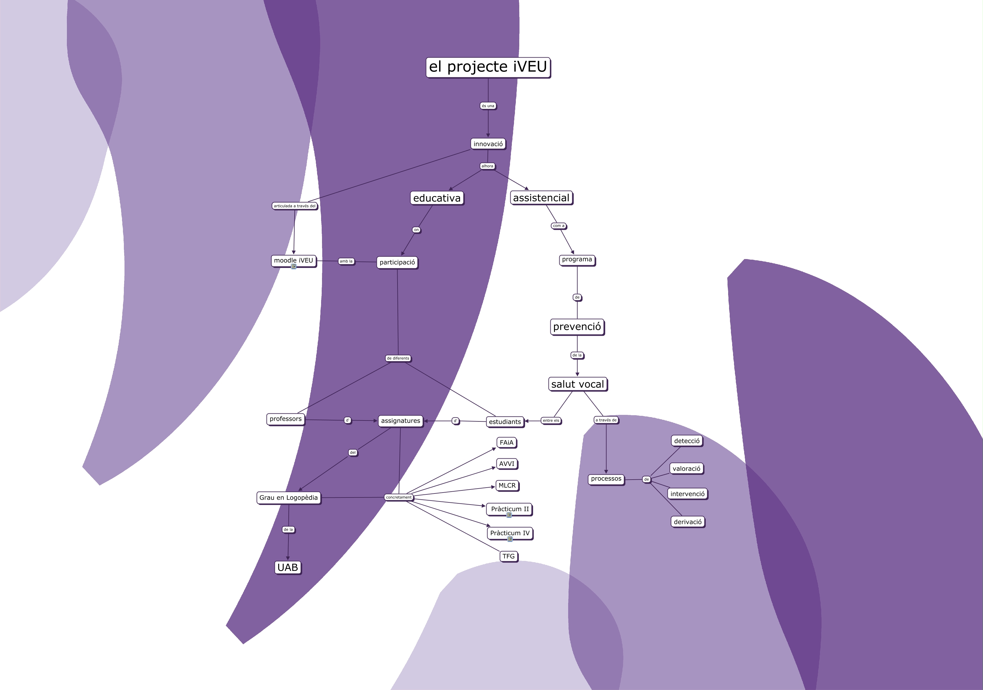 Aquest mapa conceptual conté informació relacionada amb: projecte iVEU, salut vocal entre els estudiants, professors d' assignatures, assignatures concretament TFG, processos de valoració, estudiants d' assignatures, programa de prevenció, educativa on participació, assignatures concretament Pràcticum IV, salut vocal a través de processos, processos de derivació, prevenció de la salut vocal, assignatures concretament Pràcticum II, assignatures concretament AVVI, assignatures concretament MLCR, Grau en Logopèdia concretament AVVI, Grau en Logopèdia de la UAB, innovació alhora assistencial, participació de diferents estudiants, assignatures del Grau en Logopèdia, moodle iVEU amb la participació