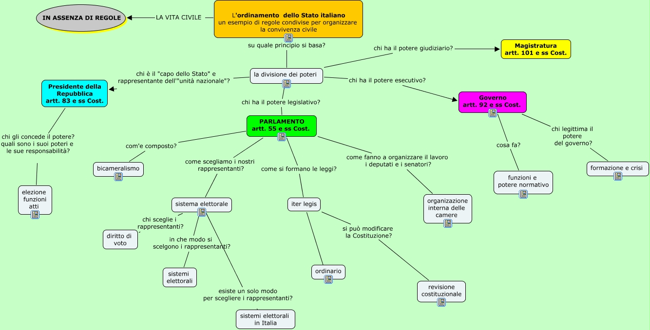 Questa Cmap, creata con IHMC CmapTools, contiene informazioni relative a: L'ORDINAMENTO DELLO STATO ITALIANO, PARLAMENTO artt. 55 e ss Cost. come fanno a organizzare il lavoro i deputati e i senatori? organizazione interna delle camere, sistema elettorale esiste un solo modo per scegliere i rappresentanti? sistemi elettorali in Italia, PARLAMENTO artt. 55 e ss Cost. come si formano le leggi? iter legis, iter legis si può modificare la Costituzione? revisione costituzionale, la divisione dei poteri chi ha il potere giudiziario? Magistratura artt. 101 e ss Cost., la divisione dei poteri chi ha il potere legislativo? PARLAMENTO artt. 55 e ss Cost., sistema elettorale in che modo si scelgono i rappresentanti? sistemi elettorali, Governo artt. 92 e ss Cost. cosa fa? funzioni e potere normativo, Governo artt. 92 e ss Cost. chi legittima il potere del governo? formazione e crisi, PARLAMENTO artt. 55 e ss Cost. com'e composto? bicameralismo, iter legis ???? ordinario, PARLAMENTO artt. 55 e ss Cost. come scegliamo i nostri rappresentanti? sistema elettorale, L'ordinamento dello Stato italiano un esempio di regole condivise per organizzare la convivenza civile su quale principio si basa? la divisione dei poteri, L'ordinamento dello Stato italiano un esempio di regole condivise per organizzare la convivenza civile LA VITA CIVILE IN ASSENZA DI REGOLE, sistema elettorale chi sceglie i rappresentanti? diritto di voto, la divisione dei poteri chi è il "capo dello Stato" e rappresentante dell'"unità nazionale"? Presidente della Repubblica artt. 83 e ss Cost., la divisione dei poteri chi ha il potere esecutivo? Governo artt. 92 e ss Cost., Presidente della Repubblica artt. 83 e ss Cost. chi gli concede il potere? quali sono i suoi poteri e le sue responsabilità? elezione funzioni atti