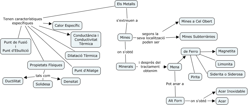 Aquest mapa conceptual conté informació relacionada amb: Mapa Conceptual Els Metalls, Els Metalls Tenen característiques específiques Conductància i Conductivitat Tèrmica, Mena ???? de Ferro, Propietats Físiques tals com Solidesa, Els Metalls Tenen característiques específiques Propietats Físiques, Propietats Físiques tals com Ductilitat, Propietats Físiques tals com Densitat, Els Metalls Tenen característiques específiques Punt de Fusió i Punt d'Ebullició, de Ferro ???? Limonita, Els Metalls s'extreuen a Mines, de Ferro ???? Siderita o Siderosa, Minerals i després del tractament obtenim Mena, Alt Forn on s'obté Acer Inoxidable, Alt Forn on s'obté Acer, Els Metalls Tenen característiques específiques Calor Específic, Mena Pot anar a Alt Forn, Mines segons la seva localització poden ser Mines Subterrànies, de Ferro ???? Pirita, Mines on s'obté Minerals, de Ferro ???? Magnetita, Els Metalls Tenen característiques específiques Punt d'Aliatge