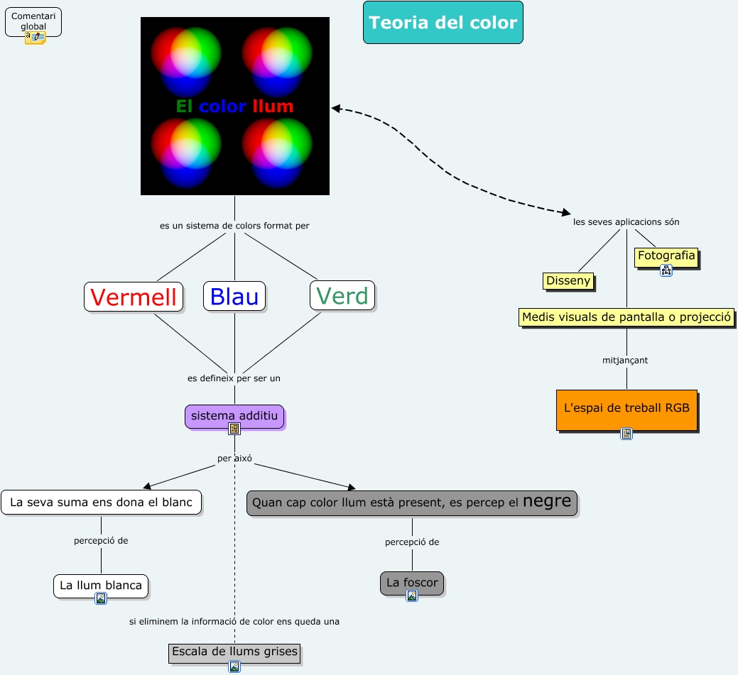 Aquest mapa conceptual conté informació relacionada amb: Tasca 4 colors llum amb recursos, Quan cap color llum està present, es percep el negre percepció de La foscor, El color llum es un sistema de colors format per Vermell, sistema additiu per aixó La seva suma ens dona el blanc, El color llum les seves aplicacions són Disseny, Blau es defineix per ser un sistema additiu, La seva suma ens dona el blanc percepció de La llum blanca, El color llum les seves aplicacions són Fotografia, Vermell es defineix per ser un sistema additiu, El color llum les seves aplicacions són Medis visuals de pantalla o projecció, Medis visuals de pantalla o projecció mitjançant L'espai de treball RGB, El color llum es un sistema de colors format per Verd, El color llum es un sistema de colors format per Blau, sistema additiu si eliminem la informació de color ens queda una Escala de llums grises, Verd es defineix per ser un sistema additiu, sistema additiu per aixó Quan cap color llum està present, es percep el negre