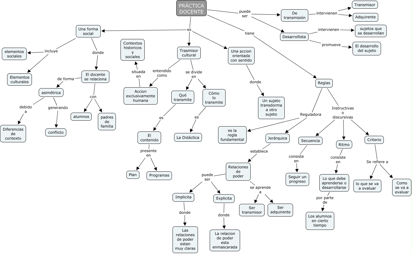 Este Cmap, tiene información relacionada con: Práctica Docente 2, Accion exclusivamente humana situada en Contextos historicos y sociales, El docente se relaciona con alumnos, Trasmisor cultural se divide en Cómo lo transmite, PRÁCTICA DOCENTE puede ser De transmisión, Jerárquica establece Relaciones de poder, Lo que debe aprenderse o desarrollarse por parte de Los alumnos en cierto tiempo, Desarrollista intervienen sujetos que se desarrollan, El contenido presente en Plan, Una accion orientada con sentido donde Un sujeto transdorma a otro sujeto, Reglas Instructivas o discursivas Secuencia, De transmisión intervienen Transmisor, Cómo lo transmite es La Didáctica, Reglas Instructivas o discursivas Ritmo, Qué transmite es El contenido, Desarrollista promueve El desarrollo del sujeto, asimétrica generando conflicto, Criterio Se refiere a Como se va a evaluar, De transmisión intervienen Adquirente, Relaciones de poder puede ser Implicita, Relaciones de poder puede ser Explicita