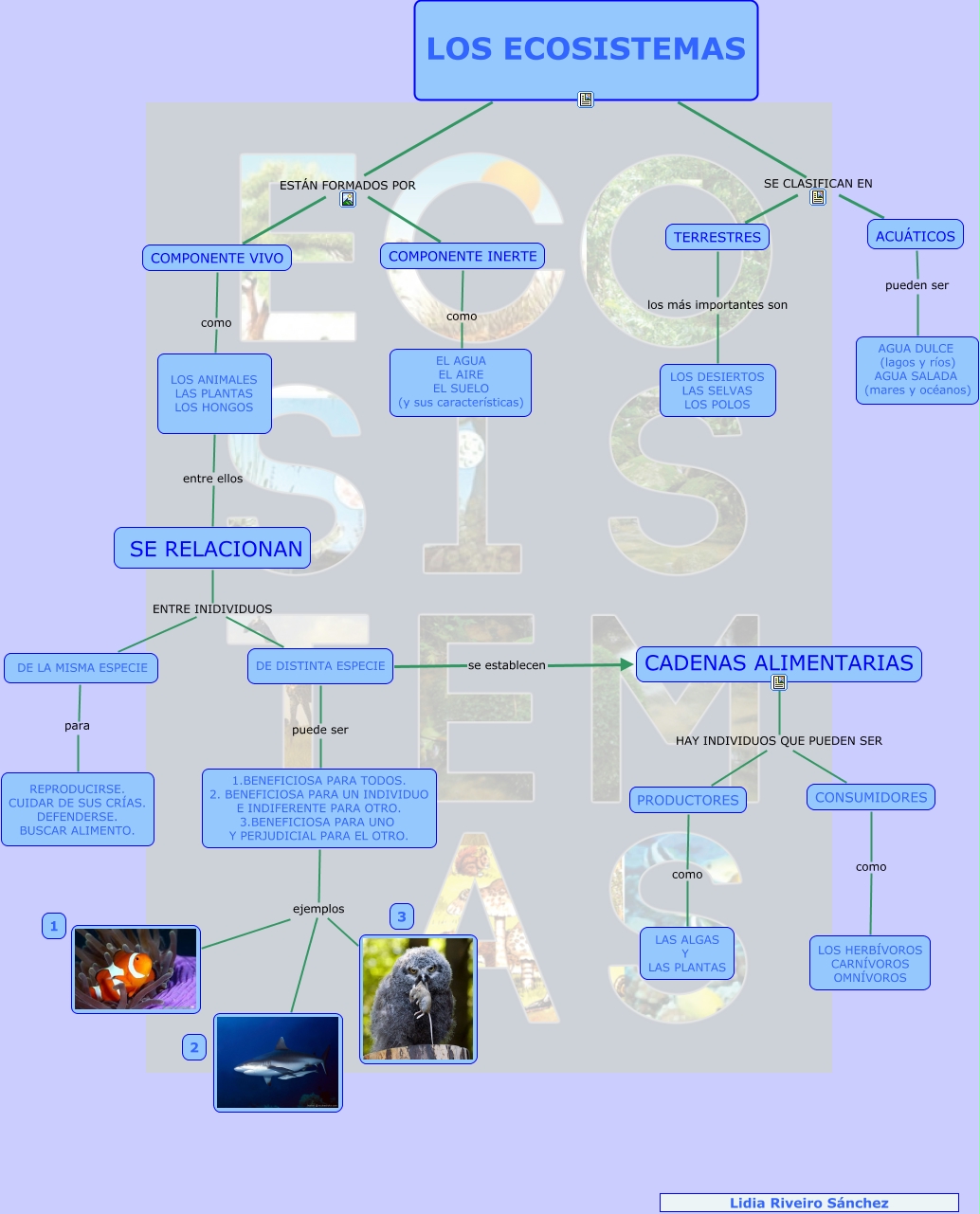 Este Cmap, tiene información relacionada con: Los ecosistemas, LOS ANIMALES LAS PLANTAS LOS HONGOS entre ellos SE RELACIONAN, LOS ECOSISTEMAS SE CLASIFICAN EN TERRESTRES, 1.BENEFICIOSA PARA TODOS. 2. BENEFICIOSA PARA UN INDIVIDUO E INDIFERENTE PARA OTRO. 3.BENEFICIOSA PARA UNO Y PERJUDICIAL PARA EL OTRO. ejemplos, CADENAS ALIMENTARIAS HAY INDIVIDUOS QUE PUEDEN SER CONSUMIDORES, LOS ECOSISTEMAS SE CLASIFICAN EN ACUÁTICOS, COMPONENTE VIVO como LOS ANIMALES LAS PLANTAS LOS HONGOS, COMPONENTE INERTE como EL AGUA EL AIRE EL SUELO (y sus características), ACUÁTICOS pueden ser AGUA DULCE (lagos y ríos) AGUA SALADA (mares y océanos), PRODUCTORES como LAS ALGAS Y LAS PLANTAS, TERRESTRES los más importantes son LOS DESIERTOS LAS SELVAS LOS POLOS, DE DISTINTA ESPECIE puede ser 1.BENEFICIOSA PARA TODOS. 2. BENEFICIOSA PARA UN INDIVIDUO E INDIFERENTE PARA OTRO. 3.BENEFICIOSA PARA UNO Y PERJUDICIAL PARA EL OTRO., 1.BENEFICIOSA PARA TODOS. 2. BENEFICIOSA PARA UN INDIVIDUO E INDIFERENTE PARA OTRO. 3.BENEFICIOSA PARA UNO Y PERJUDICIAL PARA EL OTRO. ejemplos, SE RELACIONAN ENTRE INIDIVIDUOS DE DISTINTA ESPECIE, LOS ECOSISTEMAS ESTÁN FORMADOS POR COMPONENTE VIVO, DE LA MISMA ESPECIE para REPRODUCIRSE. CUIDAR DE SUS CRÍAS. DEFENDERSE. BUSCAR ALIMENTO., SE RELACIONAN ENTRE INIDIVIDUOS DE LA MISMA ESPECIE, DE DISTINTA ESPECIE se establecen CADENAS ALIMENTARIAS, LOS ECOSISTEMAS ESTÁN FORMADOS POR COMPONENTE INERTE, CADENAS ALIMENTARIAS HAY INDIVIDUOS QUE PUEDEN SER PRODUCTORES, CONSUMIDORES como LOS HERBÍVOROS CARNÍVOROS OMNÍVOROS