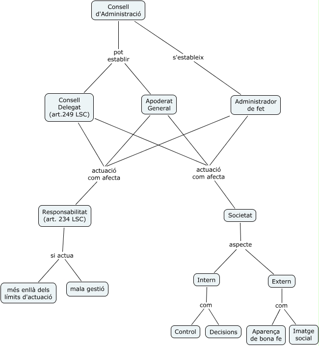 Este Cmap, tiene información relacionada con: Escenari 9, Apoderat General actuació com afecta Responsabilitat (art. 234 LSC), Societat aspecte Intern, Consell Delegat (art.249 LSC) actuació com afecta Societat, Apoderat General actuació com afecta Societat, Societat aspecte Extern, Extern com Aparença de bona fe, Responsabilitat (art. 234 LSC) si actua més enllà dels límits d'actuació, Extern com Imatge social, Intern com Decisions, Administrador de fet actuació com afecta Societat, Consell d'Administració pot establir Consell Delegat (art.249 LSC), Consell Delegat (art.249 LSC) actuació com afecta Responsabilitat (art. 234 LSC), Intern com Control, Consell d'Administració pot establir Apoderat General, Administrador de fet actuació com afecta Responsabilitat (art. 234 LSC), Consell d'Administració s'estableix Administrador de fet, Responsabilitat (art. 234 LSC) si actua mala gestió