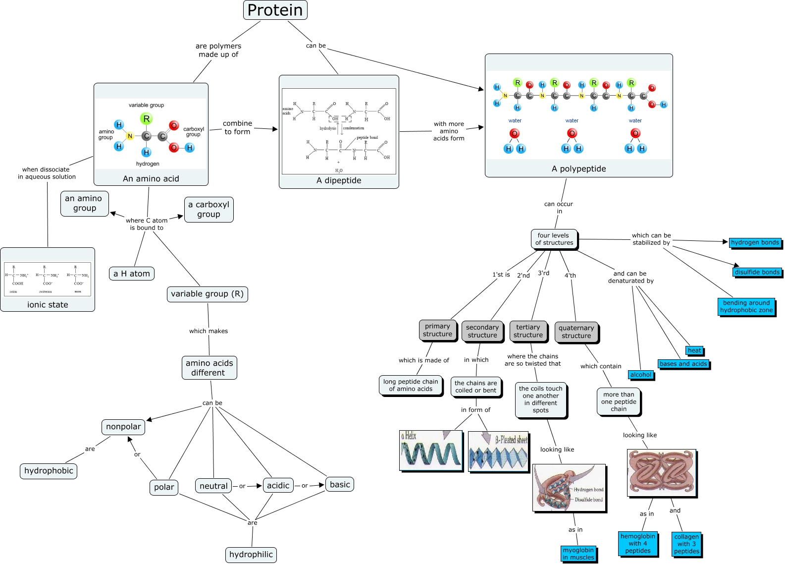 This Concept Map, created with IHMC CmapTools, has information related to: protein_edited_ct, An amino acid when dissociate in aqueous solution ionic state, the coils touch one another in different spots looking like, An amino acid where C atom is bound to a carboxyl group, basic are hydrophilic, four levels of structures and can be denaturated by heat, four levels of structures which can be stabilized by hydrogen bonds, four levels of structures 1'st is primary structure, four levels of structures and can be denaturated by bases and acids, more than one peptide chain looking like, quaternary structure which contain more than one peptide chain, as in hemoglobin with 4 peptides, polar or nonpolar, four levels of structures which can be stabilized by disulfide bonds, four levels of structures which can be stabilized by bending around hydrophobic zone, four levels of structures 2'nd secondary structure, four levels of structures and can be denaturated by alcohol, four levels of structures 3'rd tertiary structure, four levels of structures 4'th quaternary structure, amino acids different can be basic, as in myoglobin in muscles