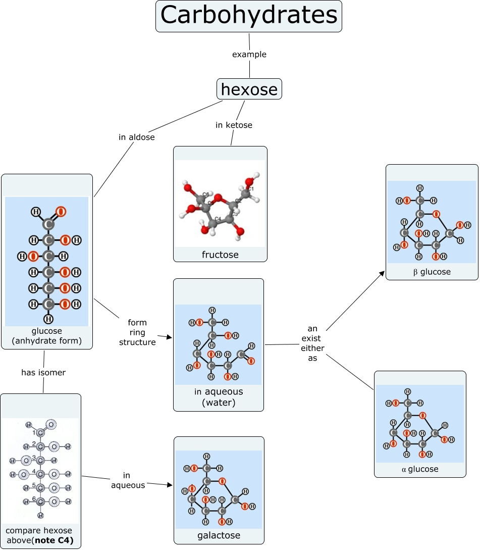 This Concept Map, created with IHMC CmapTools, has information related to: carbohydrate_practical, glucose (anhydrate form) has isomer compare hexose above(note C4), compare hexose above(note C4) in aqueous galactose, Carbohydrates example hexose, hexose in ketose fructose, hexose in aldose glucose (anhydrate form), in aqueous (water) an exist either as α glucose, glucose (anhydrate form) form ring structure in aqueous (water), in aqueous (water) an exist either as β glucose