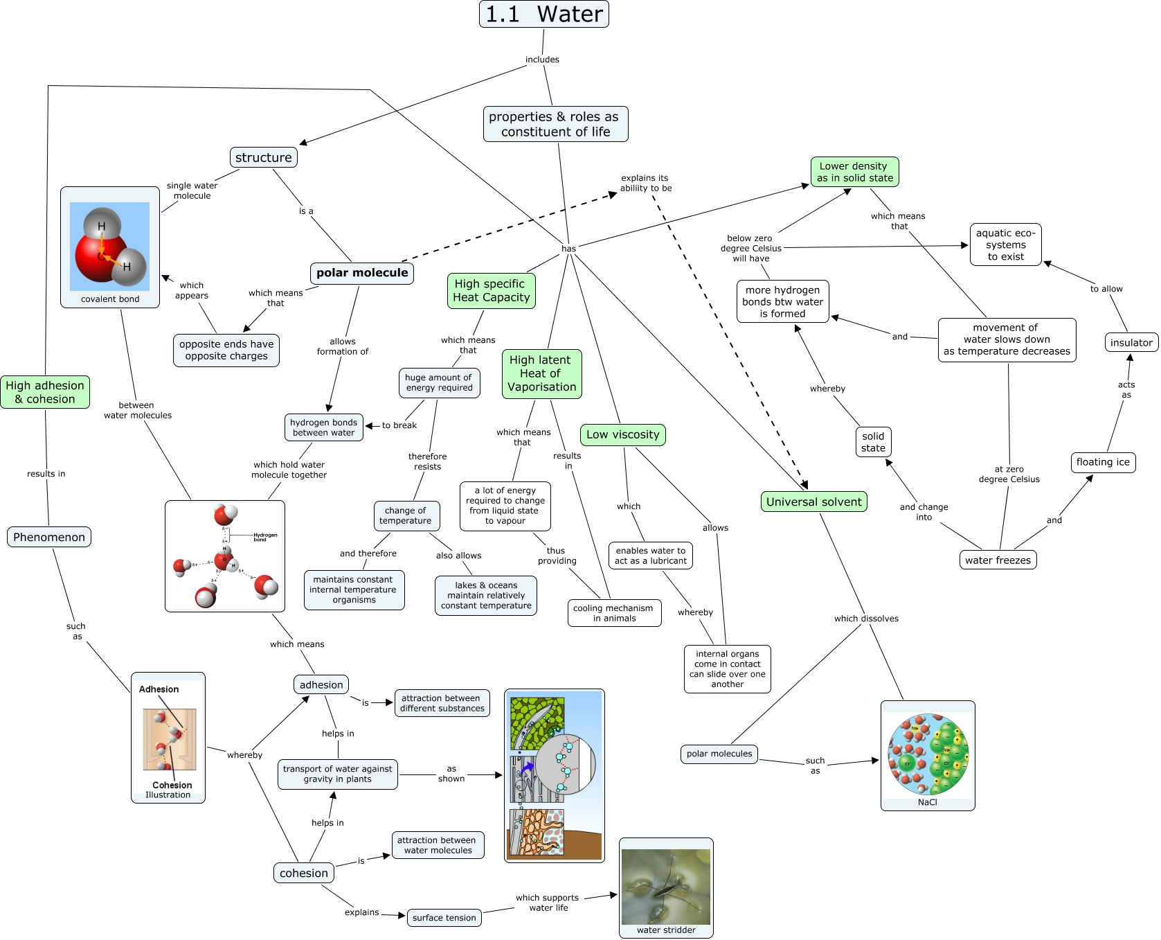 This Concept Map, created with IHMC CmapTools, has information related to: water_ct, polar molecules such as NaCl, cohesion helps in transport of water against gravity in plants, polar molecule explains its abiliity to be Universal solvent, huge amount of energy required to break hydrogen bonds between water, polar molecule which means that opposite ends have opposite charges, adhesion helps in transport of water against gravity in plants, more hydrogen bonds btw water is formed below zero degree Celsius will have Lower density as in solid state, which means adhesion, insulator to allow aquatic eco- systems to exist, Phenomenon such as Illustration, water freezes and floating ice, High adhesion & cohesion results in Phenomenon, High latent Heat of Vaporisation which means that a lot of energy required to change from liquid state to vapour, Lower density as in solid state which means that movement of water slows down as temperature decreases, 1.1 Water includes structure, transport of water against gravity in plants as shown, structure is a polar molecule, Universal solvent which dissolves polar molecules, Illustration whereby cohesion, properties & roles as constituent of life has High adhesion & cohesion