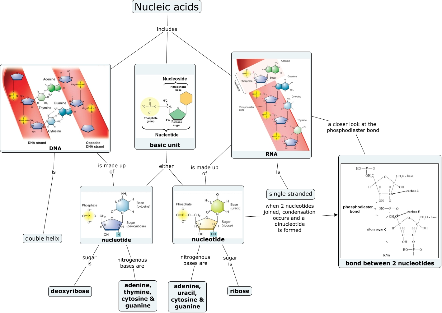 This Concept Map, created with IHMC CmapTools, has information related to: nucleic_acid_practical, nucleotide sugar is deoxyribose, DNA is double helix, nucleotide nitrogenous bases are adenine, thymine, cytosine & guanine, nucleotide when 2 nucleotides joined, condensation occurs and a dinucleotide is formed bond between 2 nucleotides, Nucleic acids includes RNA, DNA is made up of nucleotide, nucleotide sugar is ribose, Nucleic acids includes DNA, nucleotide nitrogenous bases are adenine, uracil, cytosine & guanine, basic unit either nucleotide, RNA is single stranded, basic unit either nucleotide, RNA a closer look at the phosphodiester bond bond between 2 nucleotides, Nucleic acids includes basic unit, RNA is made up of nucleotide