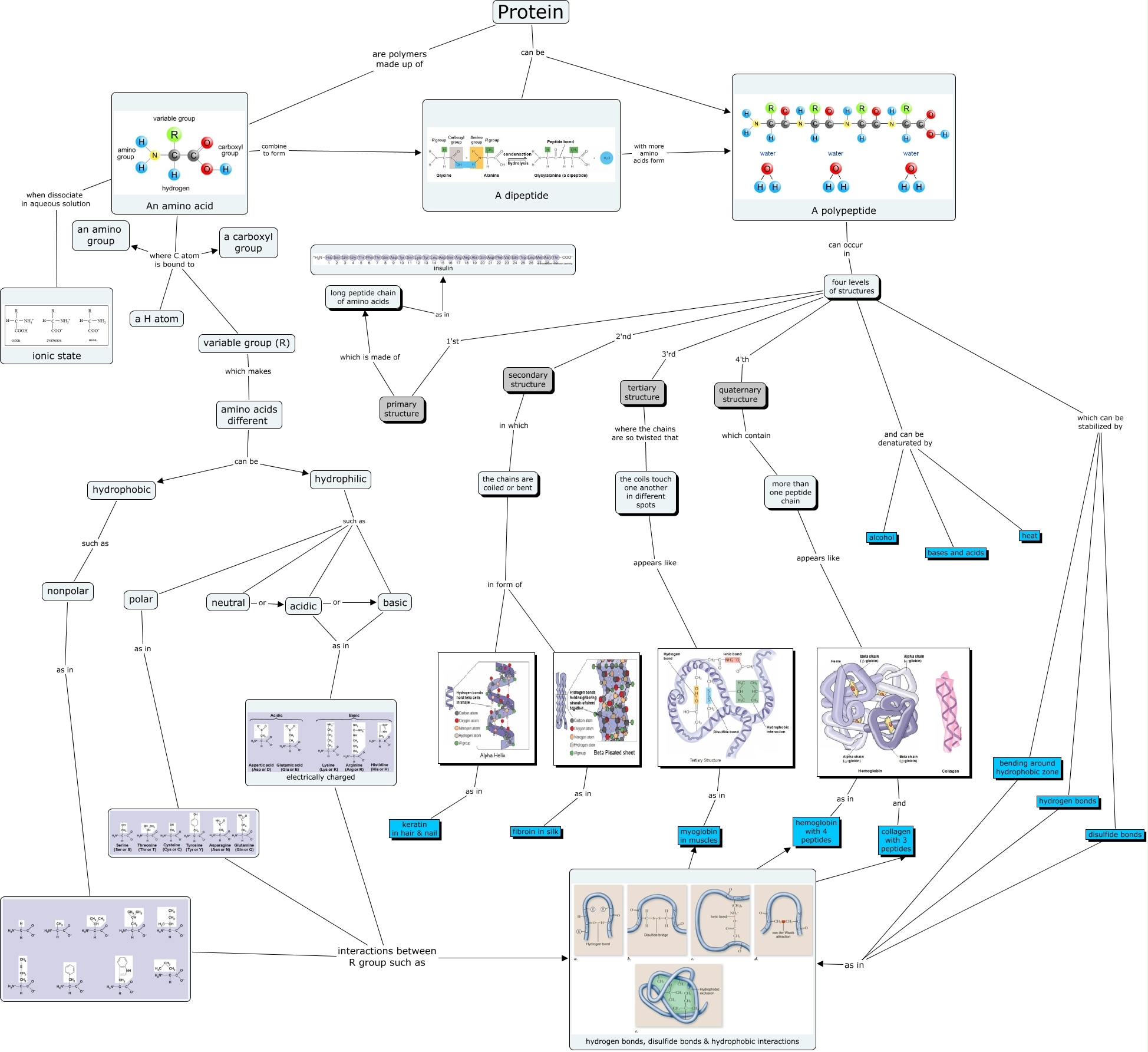 This Concept Map, created with IHMC CmapTools, has information related to: protein_detail_ct, An amino acid combine to form A dipeptide, four levels of structures and can be denaturated by alcohol, nonpolar as in, the chains are coiled or bent in form of, neutral or acidic, hydrogen bonds, disulfide bonds & hydrophobic interactions ???? myoglobin in muscles, A dipeptide with more amino acids form A polypeptide, An amino acid where C atom is bound to variable group (R), An amino acid when dissociate in aqueous solution ionic state, hydrogen bonds as in hydrogen bonds, disulfide bonds & hydrophobic interactions, variable group (R) which makes amino acids different, amino acids different can be hydrophobic, hydrophobic such as nonpolar, four levels of structures 4'th quaternary structure, quaternary structure which contain more than one peptide chain, more than one peptide chain appears like, Protein can be A dipeptide, tertiary structure where the chains are so twisted that the coils touch one another in different spots, acidic as in electrically charged, disulfide bonds as in hydrogen bonds, disulfide bonds & hydrophobic interactions