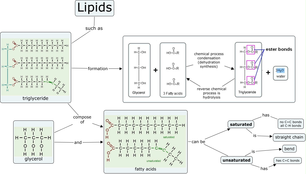 This Concept Map, created with IHMC CmapTools, has information related to: triglyceride_practical, glycerol and fatty acids, Lipids such as triglyceride, saturated has no C=C bonds all C-H bonds, unsaturated has has C=C bonds, triglyceride formation, saturated is straight chain, triglyceride compose of fatty acids, fatty acids can be saturated, fatty acids can be unsaturated, unsaturated is bend, triglyceride compose of glycerol