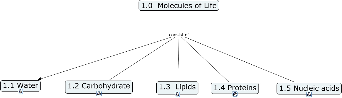This Concept Map, created with IHMC CmapTools, has information related to: Molecules of Life, 1.0 Molecules of Life consist of 1.3 Lipids, 1.0 Molecules of Life consist of 1.2 Carbohydrate, 1.0 Molecules of Life consist of 1.4 Proteins, 1.0 Molecules of Life consist of 1.1 Water, 1.0 Molecules of Life consist of 1.5 Nucleic acids
