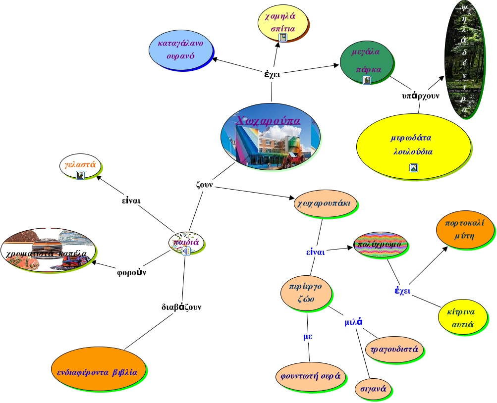 Αυτός ο εννοιολογικός χάρτης, που δημιουργήθηκε με το IHMC Cmap Tools, περιέχει πλήροφορίες που σχετίζονται με: χωχαρούπα, μεγάλα πάρκα υπάρχουν ψ η λ ά δ έ ν τ ρ α, παιδιά είναι γελαστά, περίεργο ζώο με φουντωτή ουρά, περίεργο ζώο μιλά τραγουδιστά, Χωχαρούπα έχει χαμηλά σπίτια, μεγάλα πάρκα υπάρχουν μυρωδάτα λουλούδια, Χωχαρούπα έχει καταγάλανο ουρανό, Χωχαρούπα ζουν παιδιά, παιδιά διαβάζουν ενδιαφέροντα βιβλία, παιδιά φορούν χρωματιστά καπέλα, πολύχρωμο έχει κίτρινα αυτιά, Χωχαρούπα έχει μεγάλα πάρκα, Χωχαρούπα ζουν χωχαρουπάκι, χωχαρουπάκι είναι πολύχρωμο, χωχαρουπάκι είναι περίεργο ζώο, πολύχρωμο έχει πορτοκαλί μύτη, περίεργο ζώο μιλά σιγανά