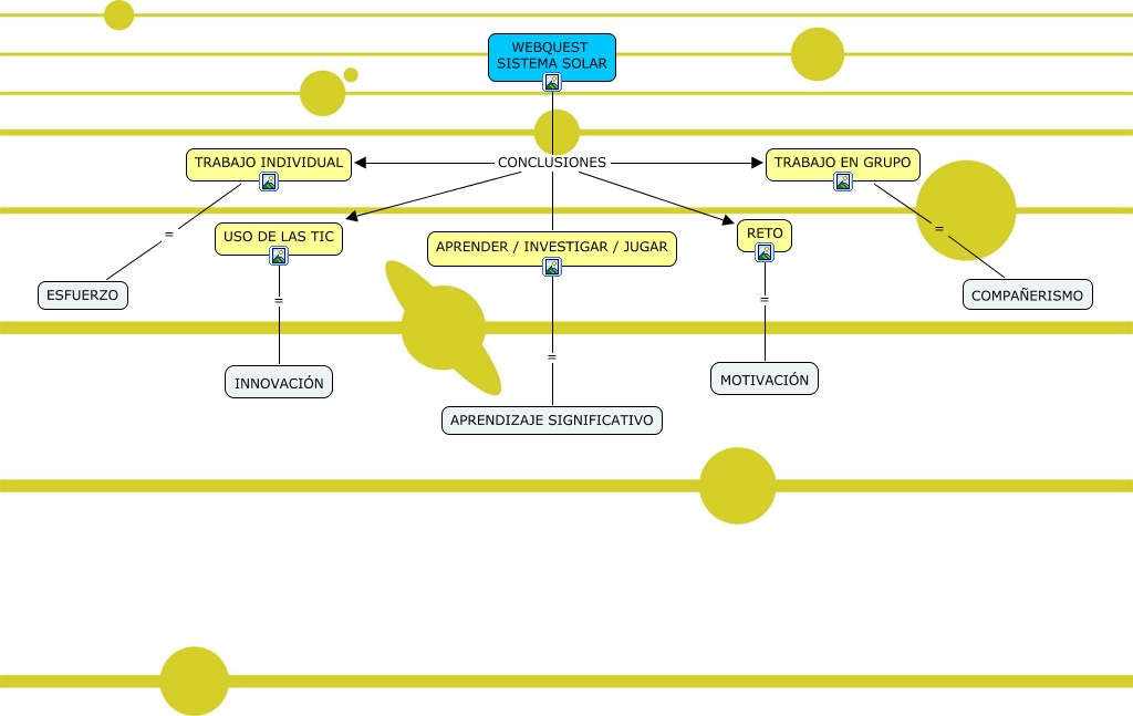 Este Cmap, tiene información relacionada con: sistema solar, RETO = MOTIVACIÓN, TRABAJO INDIVIDUAL = ESFUERZO, USO DE LAS TIC = INNOVACIÓN, WEBQUEST SISTEMA SOLAR CONCLUSIONES TRABAJO INDIVIDUAL, TRABAJO EN GRUPO = COMPAÑERISMO, WEBQUEST SISTEMA SOLAR CONCLUSIONES APRENDER / INVESTIGAR / JUGAR, WEBQUEST SISTEMA SOLAR CONCLUSIONES RETO, WEBQUEST SISTEMA SOLAR CONCLUSIONES TRABAJO EN GRUPO, WEBQUEST SISTEMA SOLAR CONCLUSIONES USO DE LAS TIC, APRENDER / INVESTIGAR / JUGAR = APRENDIZAJE SIGNIFICATIVO