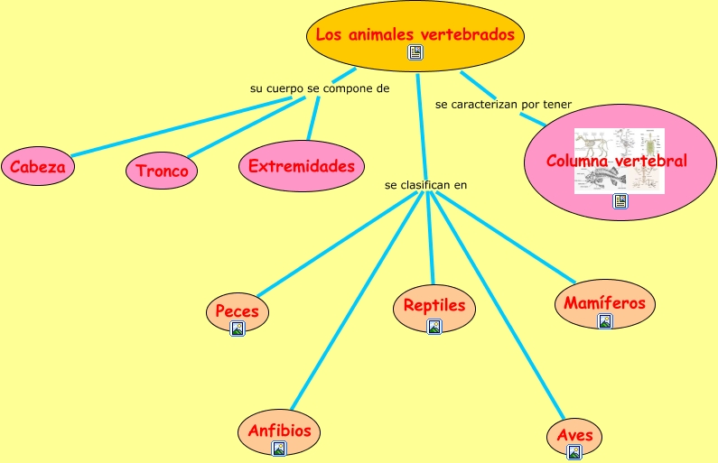 Este Cmap, tiene información relacionada con: Los animales, Los animales vertebrados su cuerpo se compone de Cabeza, Los animales vertebrados se clasifican en Peces, Los animales vertebrados su cuerpo se compone de Tronco, Los animales vertebrados su cuerpo se compone de Extremidades, Los animales vertebrados se clasifican en Anfibios, Los animales vertebrados se caracterizan por tener Columna vertebral, Los animales vertebrados se clasifican en Reptiles, Los animales vertebrados se clasifican en Mamíferos, Los animales vertebrados se clasifican en Aves