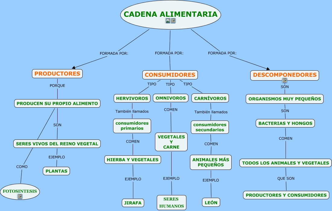 Este Cmap, tiene información relacionada con: CADENA ALIMENTARIA, PRODUCTORES PORQUE PRODUCEN SU PROPIO ALIMENTO, CADENA ALIMENTARIA FORMADA POR: CONSUMIDORES, DESCOMPONEDORES SON ORGANISMOS MUY PEQUEÑOS, CONSUMIDORES TIPO CARNÍVOROS, CADENA ALIMENTARIA FORMADA POR: DESCOMPONEDORES, OMNIVOROS COMEN VEGETALES Y CARNE, CONSUMIDORES TIPO HERVIVOROS, HERVIVOROS También llamados consumidores primarios, VEGETALES Y CARNE EJEMPLO SERES HUMANOS, CARNÍVOROS También llamados consumidores secundarios, TODOS LOS ANIMALES Y VEGETALES QUE SON PRODUCTORES Y CONSUMIDORES, consumidores primarios COMEN HIERBA Y VEGETALES, consumidores secundarios COMEN ANIMALES MÁS PEQUEÑOS, PRODUCEN SU PROPIO ALIMENTO COMO FOTOSINTESIS, HIERBA Y VEGETALES EJEMPLO JIRAFA, ANIMALES MÁS PEQUEÑOS EJEMPLO LEÓN, SERES VIVOS DEL REINO VEGETAL EJEMPLO PLANTAS, CADENA ALIMENTARIA FORMADA POR: PRODUCTORES, PRODUCEN SU PROPIO ALIMENTO SON SERES VIVOS DEL REINO VEGETAL, CONSUMIDORES TIPO OMNIVOROS