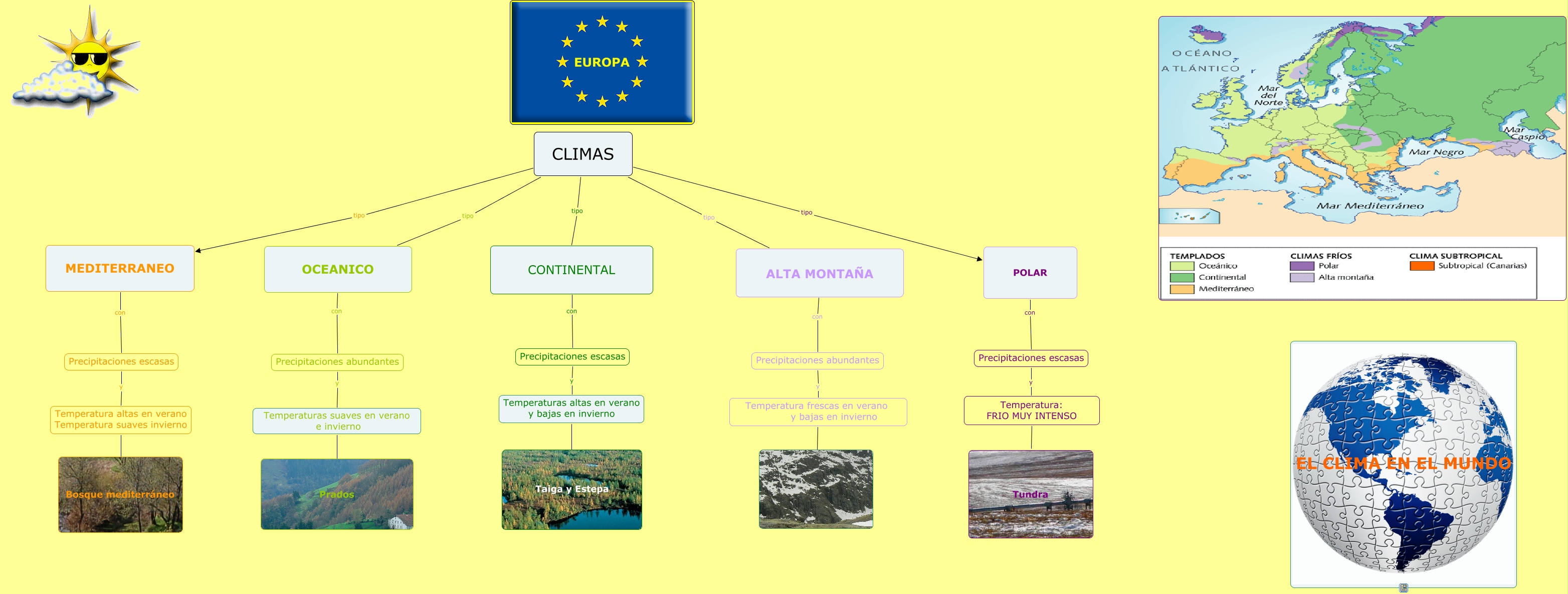 Aquest mapa conceptual conté informació relacionada amb: Climas de Europa, POLAR con Precipitaciones escasas, MEDITERRANEO con Precipitaciones escasas, CONTINENTAL con Precipitaciones escasas, Precipitaciones escasas y Temperaturas altas en verano y bajas en invierno, Precipitaciones escasas y Temperatura: FRIO MUY INTENSO, CLIMAS tipo ALTA MONTAÑA, Precipitaciones abundantes y Temperaturas suaves en verano e invierno, Temperatura frescas en verano y bajas en invierno ????, CLIMAS tipo CONTINENTAL, CLIMAS tipo POLAR, Temperaturas altas en verano y bajas en invierno ???? Taiga y Estepa, Temperaturas altas en verano y bajas en invierno ???? Taiga y Estepa, Temperatura altas en verano Temperatura suaves invierno ???? Bosque mediterráneo, Temperatura: FRIO MUY INTENSO ???? Tundra, CLIMAS tipo OCEANICO, Temperatura altas en verano Temperatura suaves invierno ???? Bosque mediterráneo, Precipitaciones abundantes y Temperatura frescas en verano y bajas en invierno, Precipitaciones escasas y Temperatura altas en verano Temperatura suaves invierno, OCEANICO con Precipitaciones abundantes, ???? ???? Prados