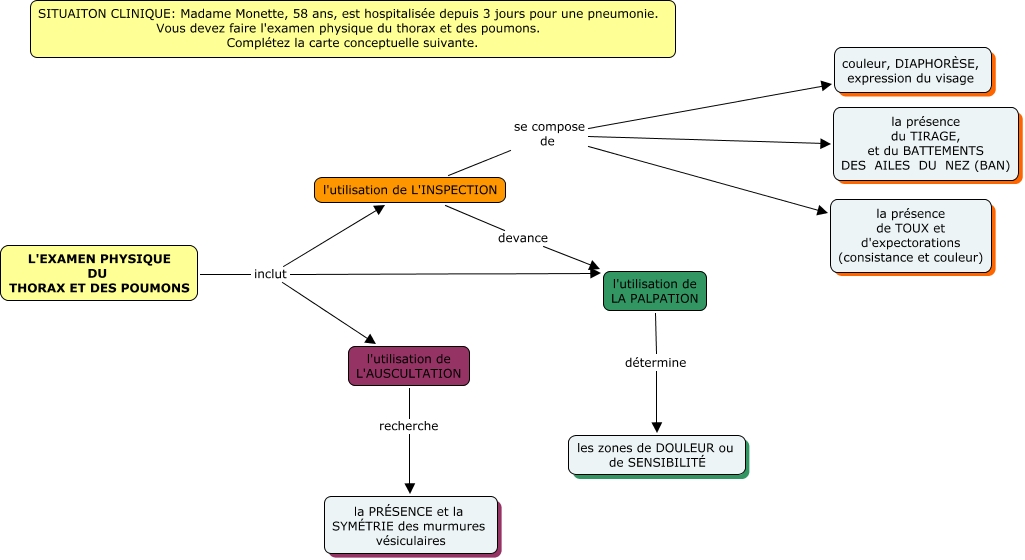 Cette carte de concepts créée avec IHMC CmapTools traite de: Exercice formatif 4_examen physique resp.corrigé, l'utilisation de LA PALPATION détermine les zones de DOULEUR ou de SENSIBILITÉ, L'EXAMEN PHYSIQUE DU THORAX ET DES POUMONS inclut l'utilisation de L'AUSCULTATION, l'utilisation de L'AUSCULTATION recherche la PRÉSENCE et la SYMÉTRIE des murmures vésiculaires, l'utilisation de L'INSPECTION se compose de couleur, DIAPHORÈSE, expression du visage, l'utilisation de L'INSPECTION se compose de la présence de TOUX et d'expectorations (consistance et couleur), L'EXAMEN PHYSIQUE DU THORAX ET DES POUMONS inclut l'utilisation de LA PALPATION, l'utilisation de L'INSPECTION devance l'utilisation de LA PALPATION, l'utilisation de L'INSPECTION se compose de la présence du TIRAGE, et du BATTEMENTS DES AILES DU NEZ (BAN), L'EXAMEN PHYSIQUE DU THORAX ET DES POUMONS inclut l'utilisation de L'INSPECTION