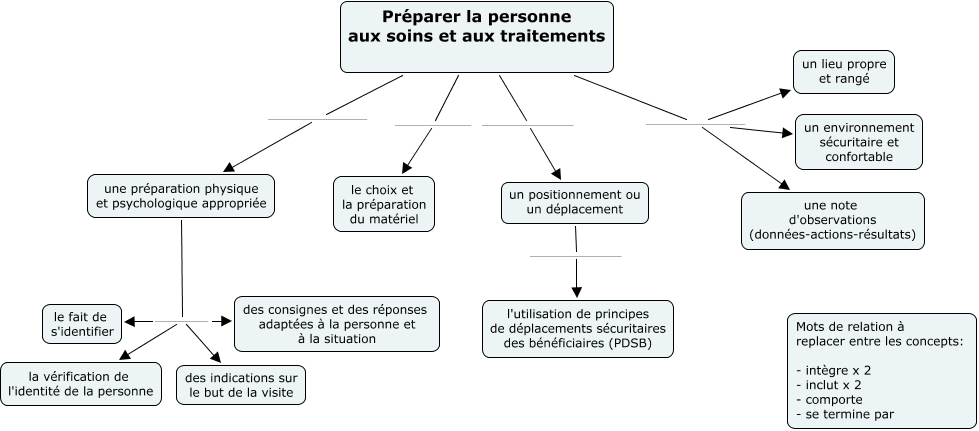 Cette carte de concepts créée avec IHMC CmapTools traite de: Exercice 3_Préparer la personne, une préparation physique et psychologique appropriée _______ des indications sur le but de la visite, une préparation physique et psychologique appropriée _______ le fait de s'identifier, Préparer la personne aux soins et aux traitements __________ le choix et la préparation du matériel, une préparation physique et psychologique appropriée _______ la vérification de l'identité de la personne, Préparer la personne aux soins et aux traitements _____________ une préparation physique et psychologique appropriée, une préparation physique et psychologique appropriée _______ des consignes et des réponses adaptées à la personne et à la situation, Préparer la personne aux soins et aux traitements _____________ un environnement sécuritaire et confortable, Préparer la personne aux soins et aux traitements _____________ une note d'observations (données-actions-résultats), Préparer la personne aux soins et aux traitements ____________ un positionnement ou un déplacement, un positionnement ou un déplacement ____________ l'utilisation de principes de déplacements sécuritaires des bénéficiaires (PDSB), Préparer la personne aux soins et aux traitements _____________ un lieu propre et rangé