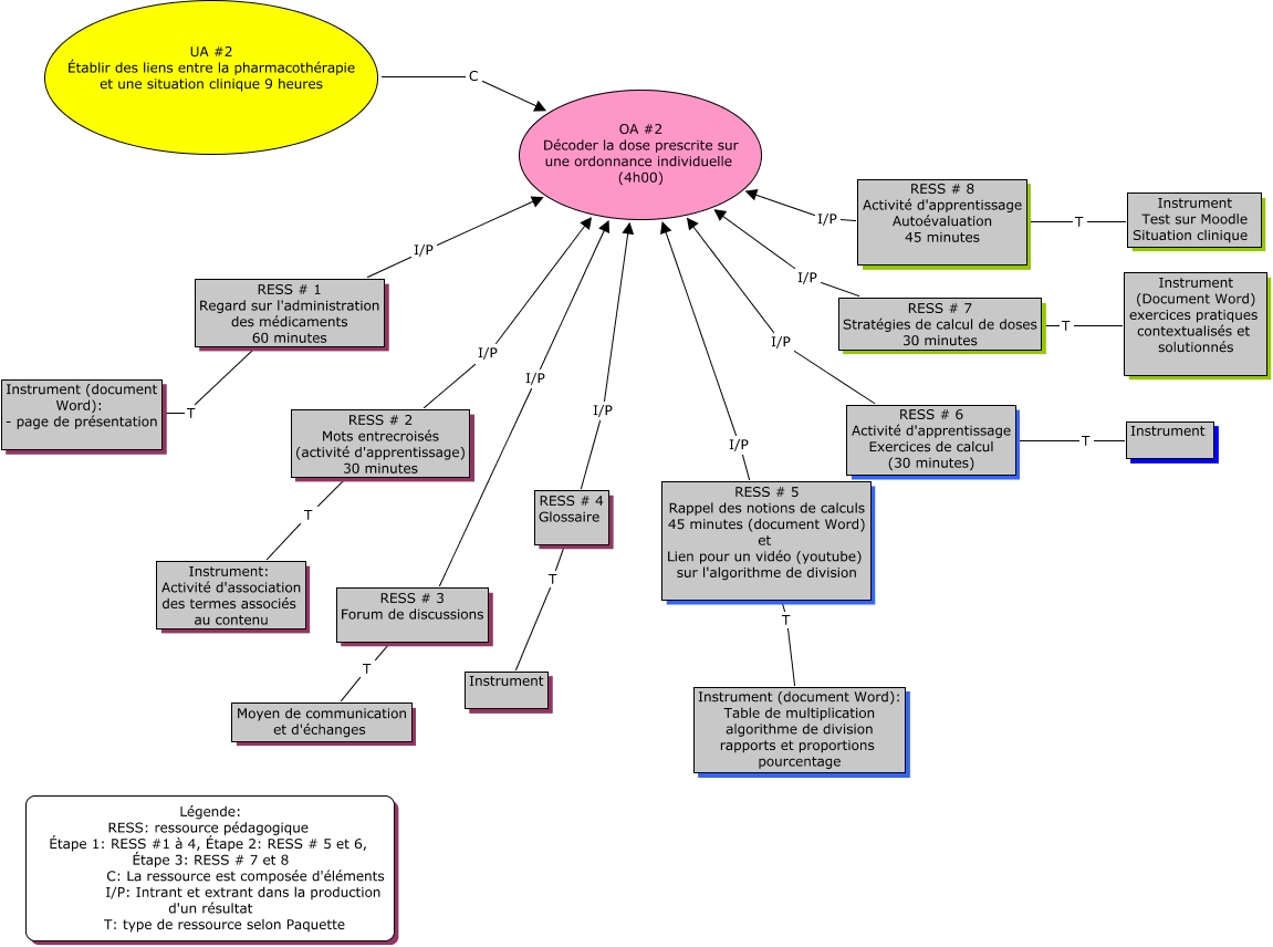 Cette carte de concepts créée avec IHMC CmapTools traite de: RESS - déroulement, RESS # 1 Regard sur l'administration des médicaments 60 minutes T Instrument (document Word): - page de présentation, RESS # 7 Stratégies de calcul de doses 30 minutes T Instrument (Document Word) exercices pratiques contextualisés et solutionnés, RESS # 6 Activité d'apprentissage Exercices de calcul (30 minutes) T Instrument, UA #2 Établir des liens entre la pharmacothérapie et une situation clinique 9 heures C OA #2 Décoder la dose prescrite sur une ordonnance individuelle (4h00), RESS # 4 Glossaire T Instrument, RESS # 8 Activité d'apprentissage Autoévaluation 45 minutes T Instrument Test sur Moodle Situation clinique, RESS # 3 Forum de discussions T Moyen de communication et d'échanges, RESS # 5 Rappel des notions de calculs 45 minutes (document Word) et Lien pour un vidéo (youtube) sur l'algorithme de division T Instrument (document Word): Table de multiplication algorithme de division rapports et proportions pourcentage