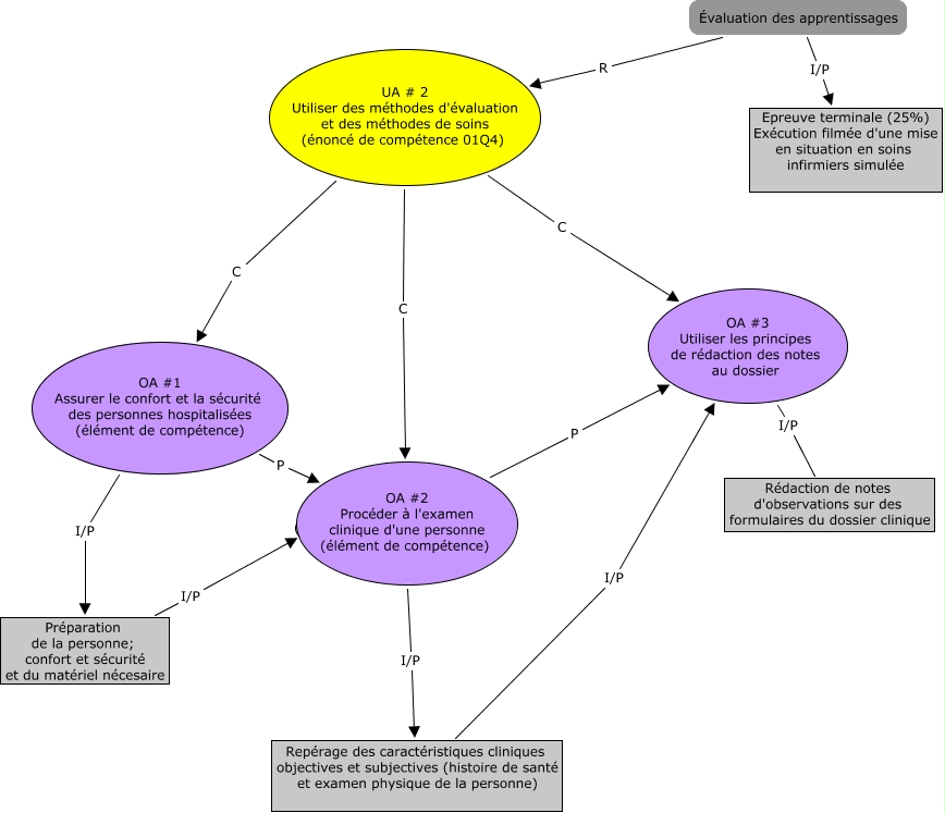 Cette carte de concepts créée avec IHMC CmapTools traite de: UA_2, OA #2 Procéder à l'examen clinique d'une personne (élément de compétence) P OA #3 Utiliser les principes de rédaction des notes au dossier, OA #3 Utiliser les principes de rédaction des notes au dossier I/P Rédaction de notes d'observations sur des formulaires du dossier clinique, UA # 2 Utiliser des méthodes d'évaluation et des méthodes de soins (énoncé de compétence 01Q4) C OA #3 Utiliser les principes de rédaction des notes au dossier, OA #2 Procéder à l'examen clinique d'une personne (élément de compétence) I/P Repérage des caractéristiques cliniques objectives et subjectives (histoire de santé et examen physique de la personne), Repérage des caractéristiques cliniques objectives et subjectives (histoire de santé et examen physique de la personne) I/P OA #3 Utiliser les principes de rédaction des notes au dossier, Préparation de la personne; confort et sécurité et du matériel nécesaire I/P ????, UA # 2 Utiliser des méthodes d'évaluation et des méthodes de soins (énoncé de compétence 01Q4) C OA #2 Procéder à l'examen clinique d'une personne (élément de compétence), OA #1 Assurer le confort et la sécurité des personnes hospitalisées (élément de compétence) P OA #2 Procéder à l'examen clinique d'une personne (élément de compétence), UA # 2 Utiliser des méthodes d'évaluation et des méthodes de soins (énoncé de compétence 01Q4) C OA #1 Assurer le confort et la sécurité des personnes hospitalisées (élément de compétence), OA #1 Assurer le confort et la sécurité des personnes hospitalisées (élément de compétence) I/P Préparation de la personne; confort et sécurité et du matériel nécesaire, Évaluation des apprentissages I/P Epreuve terminale (25%) Exécution filmée d'une mise en situation en soins infirmiers simulée