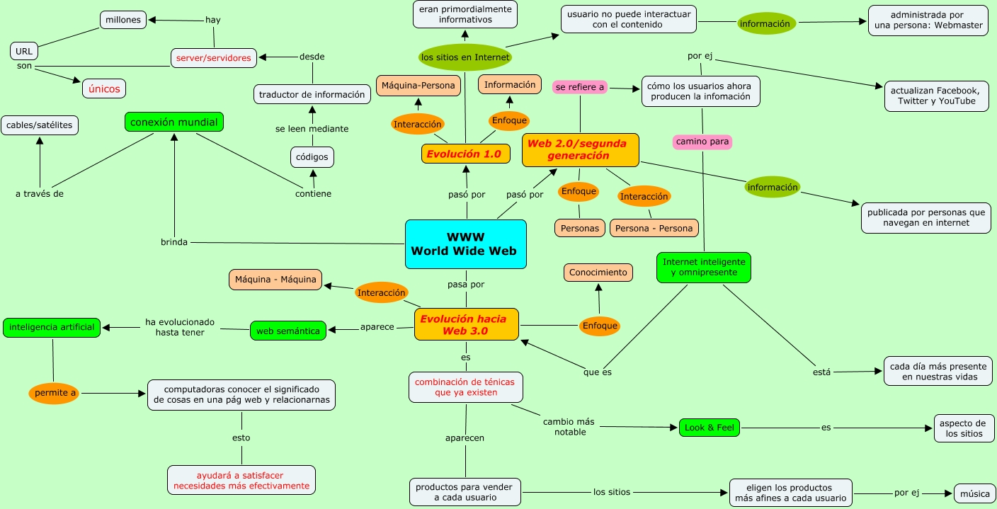 Este Cmap, tiene información relacionada con: Victoria Alvarez Igler, Web 2.0/segunda generación Interacción Persona - Persona, Web 2.0/segunda generación se refiere a cómo los usuarios ahora producen la infomación, Evolución hacia Web 3.0 Enfoque Conocimiento, eligen los productos más afines a cada usuario por ej música, cómo los usuarios ahora producen la infomación camino para Internet inteligente y omnipresente, productos para vender a cada usuario los sitios eligen los productos más afines a cada usuario, combinación de ténicas que ya existen cambio más notable Look & Feel, WWW World Wide Web pasa por Evolución hacia Web 3.0, inteligencia artificial permite a computadoras conocer el significado de cosas en una pág web y relacionarnas, Evolución hacia Web 3.0 aparece web semántica, combinación de ténicas que ya existen aparecen productos para vender a cada usuario, Internet inteligente y omnipresente está cada día más presente en nuestras vidas, WWW World Wide Web brinda conexión mundial, Evolución hacia Web 3.0 Interacción Máquina - Máquina, usuario no puede interactuar con el contenido información administrada por una persona: Webmaster, WWW World Wide Web pasó por Evolución 1.0, server/servidores son únicos, Web 2.0/segunda generación Enfoque Personas, traductor de información desde server/servidores, Evolución 1.0 los sitios en Internet usuario no puede interactuar con el contenido