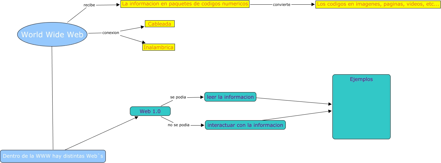 Este Cmap, tiene información relacionada con: Lucas cergnul, Dentro de la WWW hay distintas Web`s ???? Web 1.0, Web 1.0 no se podia interactuar con la informacion, Web 1.0 se podia leer la informacion, leer la informacion ???? Ejemplos, World Wide Web ???? Dentro de la WWW hay distintas Web`s, La informacion en paquetes de codigos numericos convierte Los codigos en imagenes, paginas, videos, etc..., World Wide Web conexion Inalambrica, World Wide Web conexion Cableada, interactuar con la informacion ???? Ejemplos, World Wide Web recibe La informacion en paquetes de codigos numericos