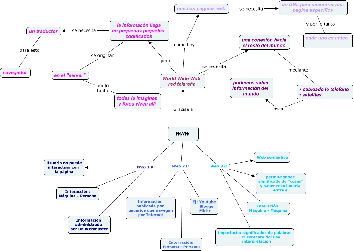 Este Cmap, tiene información relacionada con: www Caterina Pal, importacio: significados de palabras el contexto del uso interpretación Web 3.0 permite saber: significado de "cosas" y saber relacionarla entre si, en el "server" por lo tanto todas la imágines y fotos viven allí, un URL para encontrar una pagina específica y por lo tanto cada uno es único, la informacón llega en pequeños paquetes codificados se necesita un traductor, WWW Web 3.0 permite saber: significado de "cosas" y saber relacionarla entre si, la informacón llega en pequeños paquetes codificados se originan en el "server", WWW Web 2.0 Ej: Youtube Blogger Flickr, WWW Web 1.0 Información administrada por un Webmaster, WWW Gracias a World Wide Web red telaraña, una conexión hacia el resto del mundo mediante • cableado le telefono • satélites, WWW Web 3.0 Interación: Máquina - Máquina, importacio: significados de palabras el contexto del uso interpretación Web 3.0 Interación: Máquina - Máquina, WWW Web 3.0 Web semántica, WWW Web 1.0 Usuario no puede interactuar con la página, WWW Web 1.0 Interacción: Máquina - Persona, • cableado le telefono • satélites osea podemos saber información del mundo, un traductor para esto navegador, WWW Web 2.0 Información publicada por usuarios que navegan por Internet, importacio: significados de palabras el contexto del uso interpretación Web 3.0 Web semántica, World Wide Web red telaraña pero la informacón llega en pequeños paquetes codificados