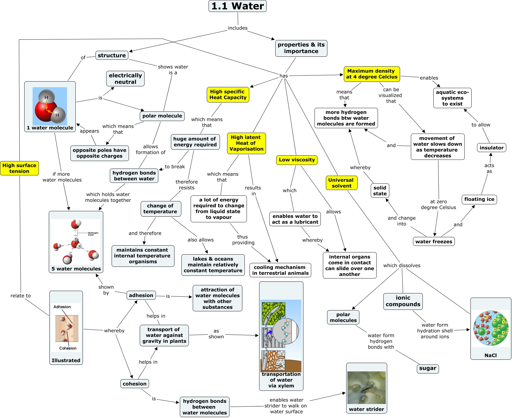 This Concept Map, created with IHMC CmapTools, has information related to: water 2013, cohesion is hydrogen bonds between water molecules, change of temperature also allows lakes & oceans maintain relatively constant temperature, enables water to act as a lubricant whereby internal organs come in contact can slide over one another, solid state whereby more hydrogen bonds btw water molecules are formed, movement of water slows down as temperature decreases and more hydrogen bonds btw water molecules are formed, properties & its importance has High latent Heat of Vaporisation, change of temperature and therefore maintains constant internal temperature organisms, floating ice acts as insulator, huge amount of energy required therefore resists change of temperature, properties & its importance has High specific Heat Capacity, polar molecules water form hydrogen bonds with sugar, properties & its importance has Maximum density at 4 degree Celcius, High surface tension relate to Illustrated, High latent Heat of Vaporisation which means that a lot of energy required to change from liquid state to vapour, Illustrated whereby cohesion, 1.1 Water includes properties & its importance, huge amount of energy required to break hydrogen bonds between water, water freezes and floating ice, adhesion helps in transport of water against gravity in plants, properties & its importance has High surface tension