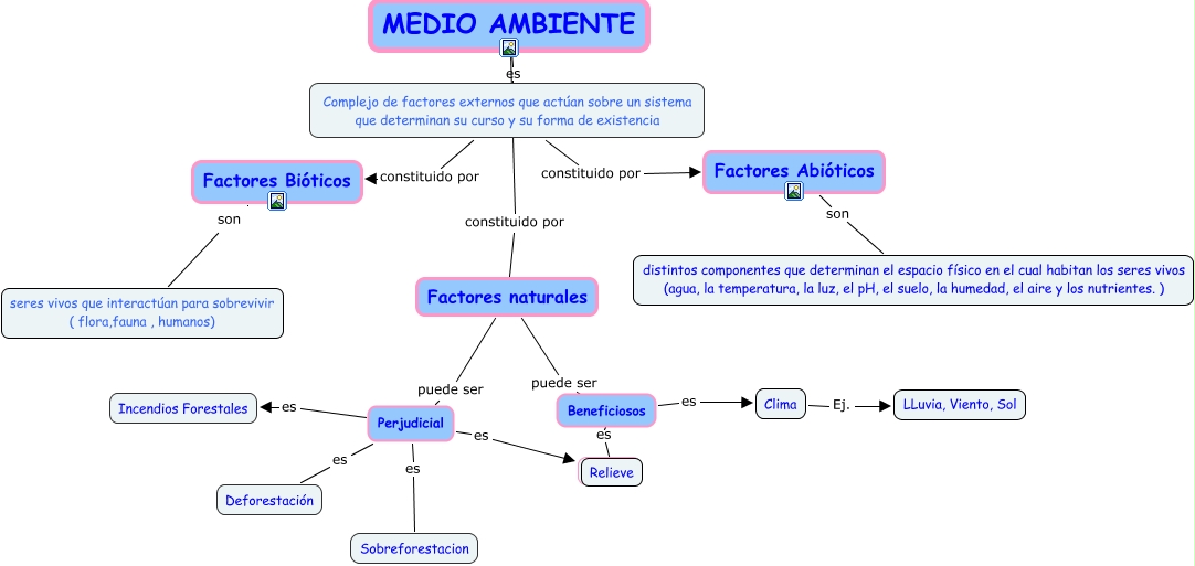 Este Cmap, tiene información relacionada con: Medio Ambiente, Factores Abióticos son distintos componentes que determinan el espacio físico en el cual habitan los seres vivos (agua, la temperatura, la luz, el pH, el suelo, la humedad, el aire y los nutrientes. ), Complejo de factores externos que actúan sobre un sistema que determinan su curso y su forma de existencia constituido por Factores Abióticos, Beneficiosos es Clima, Beneficiosos es Relieve, Factores naturales puede ser Beneficiosos, Perjudicial es Sobreforestacion, Perjudicial es Deforestación, Perjudicial es Relieve, Clima Ej. LLuvia, Viento, Sol, Perjudicial es Incendios Forestales, Factores naturales puede ser Perjudicial, Complejo de factores externos que actúan sobre un sistema que determinan su curso y su forma de existencia constituido por Factores Bióticos, Factores Bióticos son seres vivos que interactúan para sobrevivir ( flora,fauna , humanos), MEDIO AMBIENTE es Complejo de factores externos que actúan sobre un sistema que determinan su curso y su forma de existencia, MEDIO AMBIENTE constituido por Factores naturales