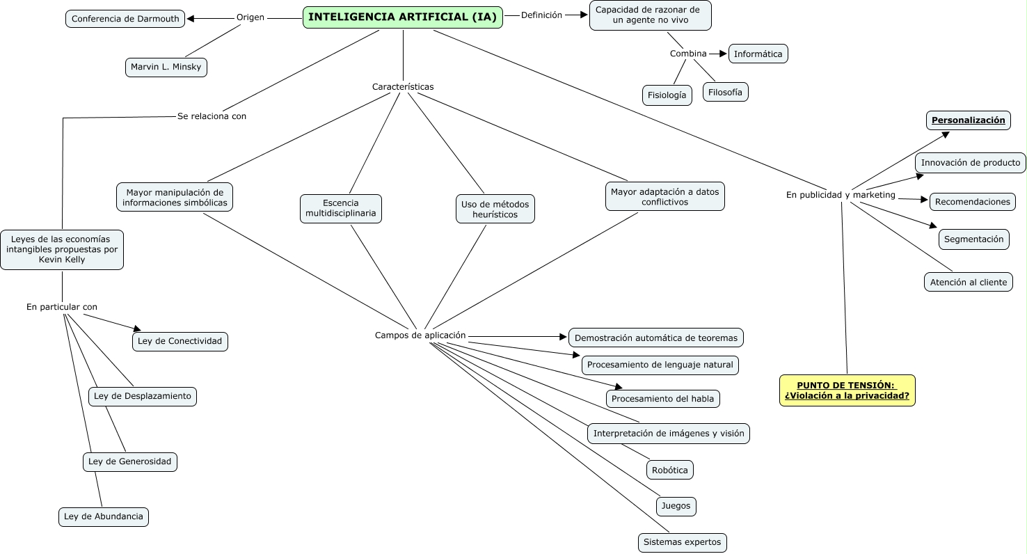 Este Cmap, tiene información relacionada con: Final Sociedad de la Comunicación, Leyes de las economías intangibles propuestas por Kevin Kelly En particular con Ley de Conectividad, Mayor adaptación a datos conflictivos Campos de aplicación Interpretación de imágenes y visión, Mayor manipulación de informaciones simbólicas Campos de aplicación Procesamiento del habla, Capacidad de razonar de un agente no vivo Combina Filosofía, INTELIGENCIA ARTIFICIAL (IA) En publicidad y marketing Recomendaciones, INTELIGENCIA ARTIFICIAL (IA) En publicidad y marketing Segmentación, Uso de métodos heurísticos Campos de aplicación Procesamiento del habla, Mayor manipulación de informaciones simbólicas Campos de aplicación Demostración automática de teoremas, INTELIGENCIA ARTIFICIAL (IA) Características Escencia multidisciplinaria, INTELIGENCIA ARTIFICIAL (IA) En publicidad y marketing PUNTO DE TENSIÓN: ¿Violación a la privacidad?, Escencia multidisciplinaria Campos de aplicación Procesamiento del habla, Uso de métodos heurísticos Campos de aplicación Procesamiento de lenguaje natural, Escencia multidisciplinaria Campos de aplicación Procesamiento de lenguaje natural, Mayor manipulación de informaciones simbólicas Campos de aplicación Robótica, INTELIGENCIA ARTIFICIAL (IA) Características Uso de métodos heurísticos, Mayor manipulación de informaciones simbólicas Campos de aplicación Interpretación de imágenes y visión, INTELIGENCIA ARTIFICIAL (IA) Características Mayor manipulación de informaciones simbólicas, INTELIGENCIA ARTIFICIAL (IA) Origen Marvin L. Minsky, Mayor manipulación de informaciones simbólicas Campos de aplicación Sistemas expertos, INTELIGENCIA ARTIFICIAL (IA) En publicidad y marketing Atención al cliente