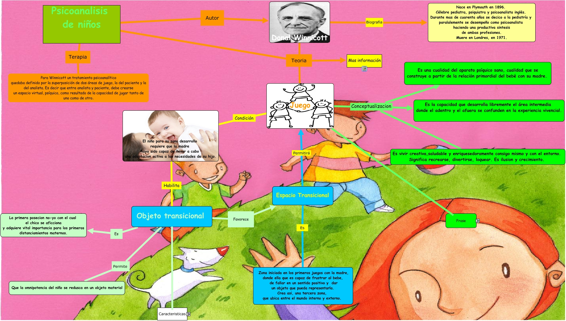 Este Cmap, tiene información relacionada con: Psicoanalisis de niños, Juego Conceptualizacion Es vivir creativa,saludable y enriquesedoramente consigo mismo y con el entorno. Significa recrearse, divertirse, loquear. Es ilusion y crecimiento., Donal Winnicott Teoria Juego, Espacio Transicional Permitirá Juego, Donal Winnicott Teoria Mas información, Psicoanalisis de niños Teoria Mas información, Espacio Transicional Es Zona iniciada en los primeros juegos con la madre, donde ella que es capaz de frustrar al bebe, de fallar en un sentido positivo y dar un objeto que pueda representarla. Crea asi, una tercera zona, que ubica entre el mundo interno y externo., Psicoanalisis de niños Teoria Juego, Juego Frase "Es en el juego y sólo en el juego que el niño o el adulto como individuos son capaces de ser creativos y de usar el total de su personalidad, y sólo al ser creativo el individuo se descubre a sí mismo" Donald Winnicott, Objeto transicional Es La primera posecion no-yo con el cual el chico se aficciona y adquiere vital importancia para los primeros distanciamientos maternos., Objeto transicional Caracteristicas Siempre es el mismo., El niño para su sano desarrollo requiere que la madre haya sido capaz de llevar a cabo una adaptacion activa a las necesidades de su hijo. Habilita Objeto transicional, Objeto transicional Caracteristicas Tiene textura suave., Objeto transicional Favorece Espacio Transicional, Objeto transicional Permite Que la omnipotencia del niño se redusca en un objeto material, Juego Conceptualizacion Es una cualidad del aparato psíquico sano, cualidad que se construye a partir de la relación primordial del bebé con su madre., Psicoanalisis de niños Terapia Para Winnicott un tratamiento psicoanalítico quedaba definido por la superposición de dos áreas de juego, la del paciente y la del analista. Es decir que entre analista y paciente, debe crearse un espacio virtual, psíquico, como resultado de la capacidad de jugar tanto de uno como de otro., Psicoanalisis de niños Autor Donal Winnicott, Juego Condición El niño para su sano desarrollo requiere que la madre haya sido capaz de llevar a cabo una adaptacion activa a las necesidades de su hijo., Donal Winnicott Biografia Nace en Plymouth en 1896. Célebre pediatra, psiquiatra y psicoanalista inglés. Durante mas de cuarenta años se decico a la pediatría y paralalemente se desempeño como psicoanalista haciendo una productiva sintesis de ambas profesiones. Muere en Londres, en 1971., Objeto transicional Caracteristicas El bebé tiene derecho sobre el.
