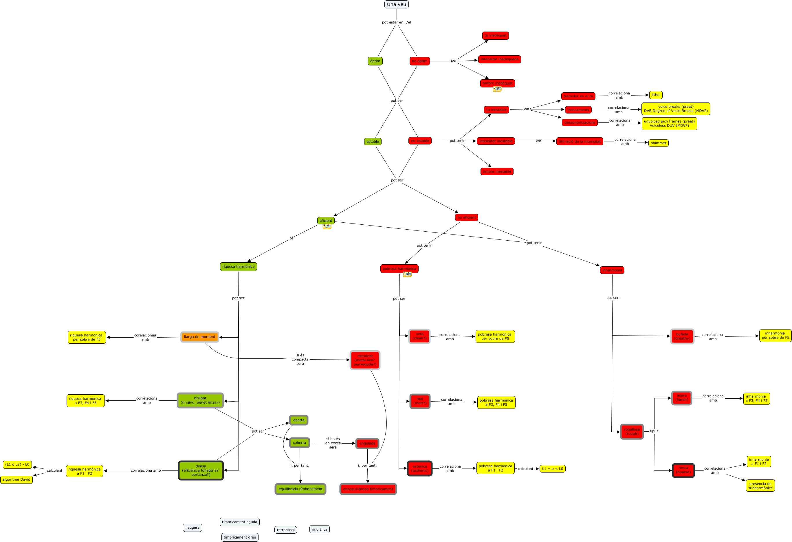 Aquest mapa conceptual conté informació relacionada amb: 130802 model perceptivoacústic, astènica (asthenic) correlaciona amb pobresa harmònica a F1 i F2, to inestable per trencaments, bufada (breathy) correlaciona amb inharmonia per sobre de F5, brillant (ringing, penetranza?) pot ser oberta, llarga de mordent corelacionna amb riquesa harmònica per sobre de F5, òptim pot ser no estable, no estable pot tenir to inestable, brillant (ringing, penetranza?) pot ser coberta, pobresa harmònica pot ser mat (matt?), riquesa harmònica a F1 i F2 calculant algoritme David, dessonoritzacions correlaciona amb unvoiced pich frames (praat) Voiceless DUV (MDVP), no òptim pot ser estable, eficient pot tenir inharmonia, estrident (metàl·lica? punxeguda?) i, per tant, desequilibrada tímbricament, no estable pot tenir timbre inestable, to inestable per tremolor en el to, no estable pot ser eficient, neta (clean?) correlaciona amb pobresa harmònica per sobre de F5, òptim pot ser estable, pobresa harmònica pot ser astènica (asthenic)