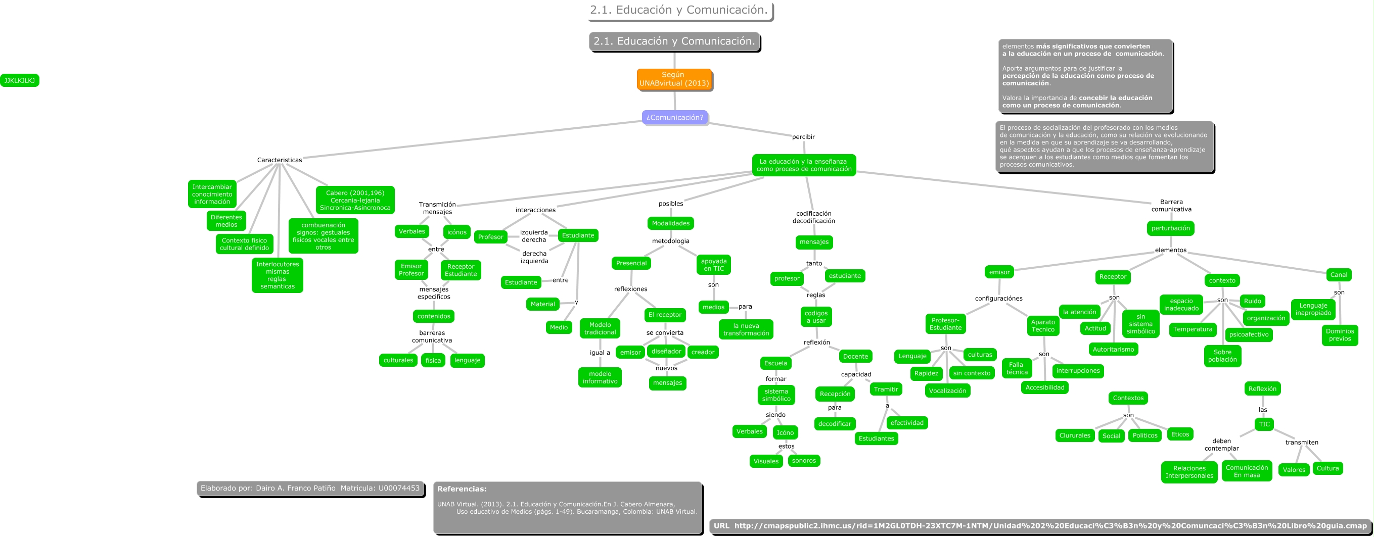 Este Cmap, tiene información relacionada con: Unidad 2 Educación y Comuncación Libro guia, TIC transmiten Cultura, Icóno estos Visuales, mensajes tanto profesor, La educación y la enseñanza como proceso de comunicación interacciones Profesor, contenidos barreras comunicativa lenguaje, TIC transmiten Valores, TIC deben contemplar Relaciones Interpersonales, Canal son Lenguaje inapropiado, Estudiante entre Estudiante, Emisor Profesor mensajes especificos Receptor Estudiante, ¿Comunicación? Caracteristicas Intercambiar conocimiento información, 2.1. Educación y Comunicación. Según UNABvirtual (2013) ¿Comunicación?, contexto son espacio inadecuado, sistema simbólico siendo Icóno, Profesor izquierda derecha Estudiante, Receptor son la atención, Profesor- Estudiante son Lenguaje, Estudiante y Material, Emisor Profesor mensajes especificos contenidos, ¿Comunicación? Caracteristicas Cabero (2001,196) Cercania-lejania Sincronica-Asincronoca