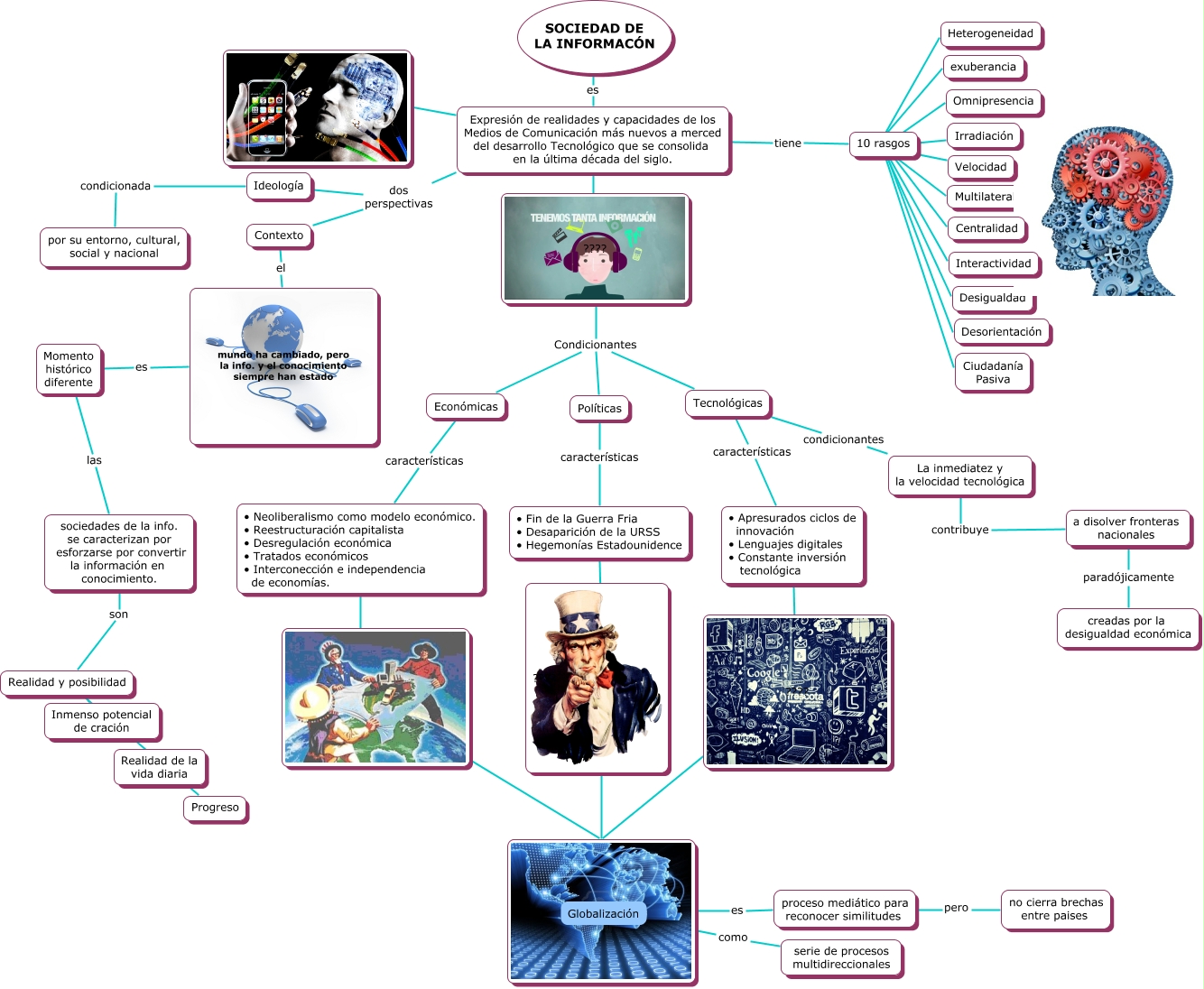 Este Cmap, tiene información relacionada con: Sociedad de la Información, 10 rasgos ???? Heterogeneidad, 10 rasgos ???? Interactividad, SOCIEDAD DE LA INFORMACÓN es Expresión de realidades y capacidades de los Medios de Comunicación más nuevos a merced del desarrollo Tecnológico que se consolida en la última década del siglo., 10 rasgos ???? Irradiación, 10 rasgos ???? Velocidad, mundo ha cambiado, pero la info. y el conocimiento siempre han estado es Momento histórico diferente, • Apresurados ciclos de innovación • Lenguajes digitales • Constante inversión tecnológica ???? ????, Tecnológicas condicionantes La inmediatez y la velocidad tecnológica, • Fin de la Guerra Fria • Desaparición de la URSS • Hegemonías Estadounidence ???? ????, Expresión de realidades y capacidades de los Medios de Comunicación más nuevos a merced del desarrollo Tecnológico que se consolida en la última década del siglo. ???? ????, Expresión de realidades y capacidades de los Medios de Comunicación más nuevos a merced del desarrollo Tecnológico que se consolida en la última década del siglo. dos perspectivas Ideología, La inmediatez y la velocidad tecnológica contribuye a disolver fronteras nacionales, 10 rasgos ???? Desorientación, 10 rasgos ???? Omnipresencia, Políticas características • Fin de la Guerra Fria • Desaparición de la URSS • Hegemonías Estadounidence, Ideología condicionada por su entorno, cultural, social y nacional, Realidad y posibilidad ???? Progreso, ???? ????, ????, 10 rasgos ???? Multilateralidad