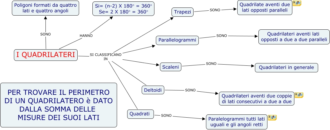 Questa Cmap, creata con IHMC CmapTools, contiene informazioni relative a: I QUADRILATERI, Deltoidi SONO Quadrilateri aventi due coppie di lati consecutivi a due a due, Scaleni SONO Quadrilateri in generale, I QUADRILATERI HANNO Si= (n-2) X 180° = 360° Se= 2 X 180° = 360°, Trapezi SONO Quadrilate aventi due lati opposti paralleli, I QUADRILATERI SI CLASSIFICANO IN Scaleni, I QUADRILATERI SI CLASSIFICANO IN Trapezi, I QUADRILATERI SI CLASSIFICANO IN Deltoidi, Quadrati SONO Paralelogrammi tutti lati uguali e gli angoli retti, I QUADRILATERI SI CLASSIFICANO IN Parallelogrammi, I QUADRILATERI SONO Poligoni formati da quattro lati e quattro angoli, I QUADRILATERI SI CLASSIFICANO IN Quadrati, Parallelogrammi SONO Quadrilateri aventi lati opposti a due a due paralleli