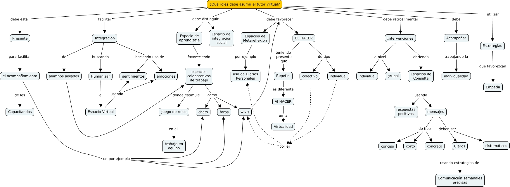 Este Cmap, tiene información relacionada con: El tutor e-learning, individual por ej wikis, Estrategias que favorezcan Empatía, mensajes de tipo conciso, el acompañamiento de los Capacitandos, Espacios de Metareflexión por ejemplo uso de Diarios Personales, wikis debe favorecer EL HACER, Intervenciones a nivel individual, EL HACER de tipo colectivo, mensajes deben ser Claros, Integración de alumnos aislados, Al HACER en la Virtualidad, Acompañar trabajando la individualidad, ¿Qué roles debe asumir el tutor virtual? debe retroalimentar Intervenciones, mensajes de tipo concreto, Espacio Virtual usando emociones, ¿Qué roles debe asumir el tutor virtual? debe distinguir Espacio de integración social, Repetir es diferente Al HACER, el acompañamiento en por ejemplo foros, colectivo por ej wikis, Espacios de Consulta usando respuestas positivas