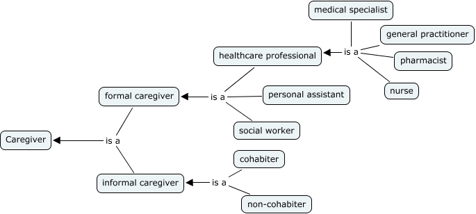 Questa Cmap, creata con IHMC CmapTools, contiene informazioni relative a: Actors-caregiver, pharmacist is a healthcare professional, healthcare professional is a formal caregiver, medical specialist is a healthcare professional, cohabiter is a informal caregiver, personal assistant is a formal caregiver, nurse is a healthcare professional, informal caregiver is a Caregiver, social worker is a formal caregiver, general practitioner is a healthcare professional, non-cohabiter is a informal caregiver, formal caregiver is a Caregiver