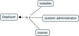 Questa Cmap, creata con IHMC CmapTools, contiene informazioni relative a: Actors-deployer, system administrator is a Deployer, trainer is a Deployer, installer is a Deployer