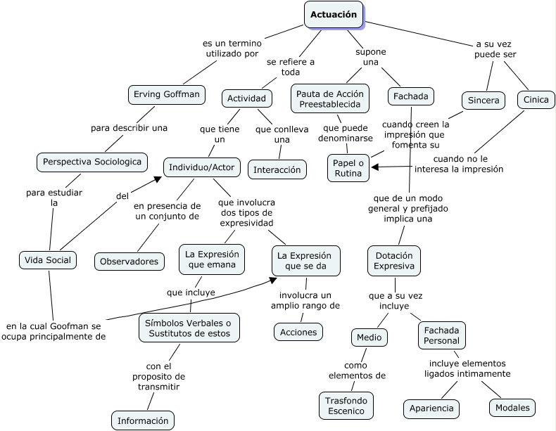 Este Cmap, tiene información relacionada con: Actuación, Individuo/Actor que involucra dos tipos de expresividad La Expresión que emana, Actuación se refiere a toda Actividad, La Expresión que se da involucra un amplio rango de Acciones, Actuación supone una Pauta de Acción Preestablecida, Perspectiva Sociologica para estudiar la Vida Social, Vida Social del Individuo/Actor, La Expresión que emana que incluye Símbolos Verbales o Sustitutos de estos, Actuación supone una Fachada, Individuo/Actor en presencia de un conjunto de Observadores, Individuo/Actor que involucra dos tipos de expresividad La Expresión que se da, Actuación a su vez puede ser Cinica, Pauta de Acción Preestablecida que puede denominarse Papel o Rutina, Fachada Personal incluye elementos ligados intimamente Apariencia, Fachada Personal incluye elementos ligados intimamente Modales, Dotación Expresiva que a su vez incluye Medio, Actuación a su vez puede ser Sincera, Actividad que tiene un Individuo/Actor, Sincera cuando creen la impresión que fomenta su Papel o Rutina, Fachada que de un modo general y prefijado implica una Dotación Expresiva, Actuación es un termino utilizado por Erving Goffman