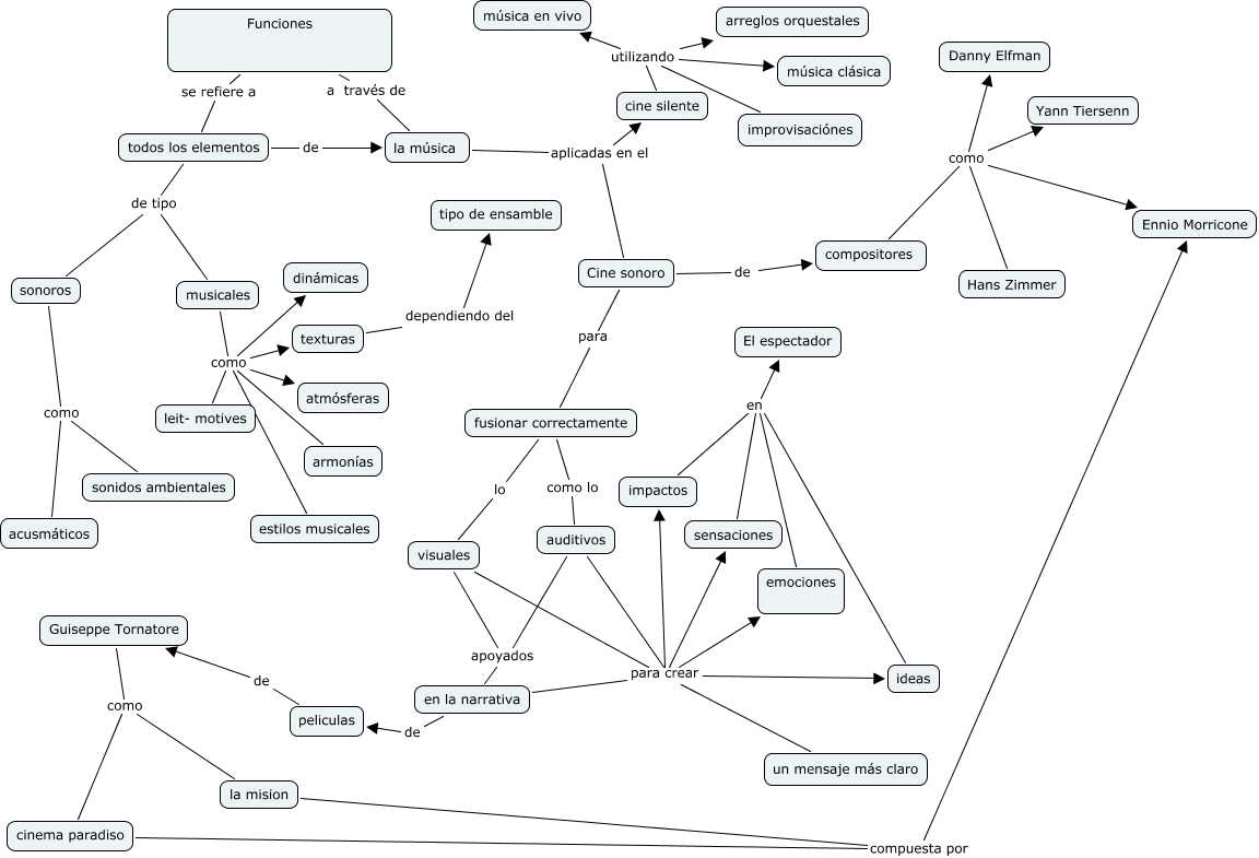 Este Cmap, tiene información relacionada con: Daniel Martínez, fusionar correctamente como lo auditivos, musicales como armonías, cine silente utilizando arreglos orquestales, compositores como Ennio Morricone, peliculas de Guiseppe Tornatore, musicales como leit- motives, en la narrativa para crear un mensaje más claro, compositores como Yann Tiersenn, auditivos para crear ideas, auditivos para crear sensaciones, visuales para crear impactos, todos los elementos de tipo sonoros, visuales para crear un mensaje más claro, fusionar correctamente lo visuales, Cine sonoro de compositores, sonoros como acusmáticos, en la narrativa para crear emociones, cine silente utilizando improvisaciónes, cinema paradiso compuesta por Ennio Morricone, auditivos para crear impactos
