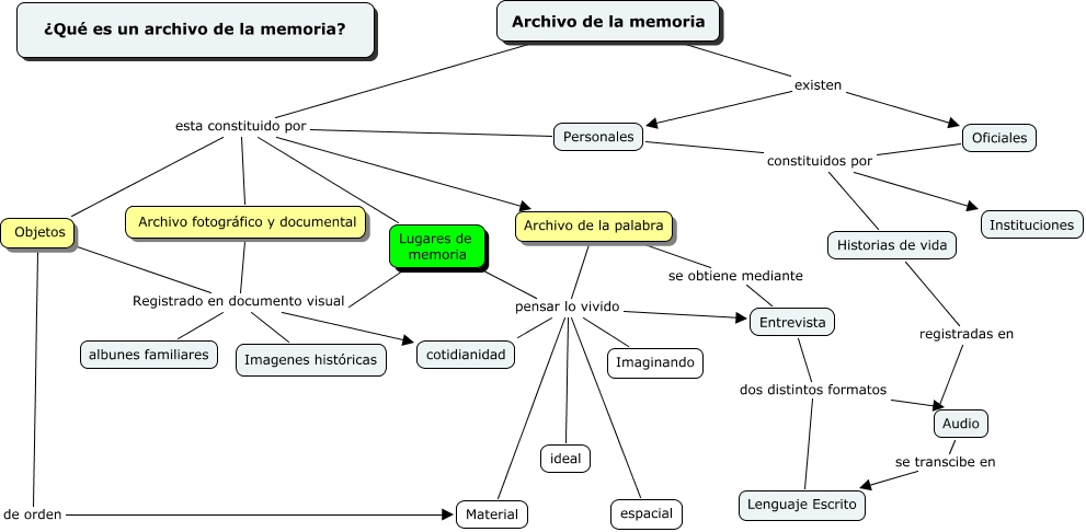 Este Cmap, tiene información relacionada con: Archivo.De.La memoria.cmap, Lugares de memoria pensar lo vivido cotidianidad, Archivo de la memoria existen Personales, Archivo de la memoria existen Oficiales, Personales esta constituido por Objetos, Archivo de la palabra pensar lo vivido Entrevista, Archivo de la memoria esta constituido por Archivo fotográfico y documental, Personales esta constituido por Lugares de memoria, Historias de vida registradas en Audio, Lugares de memoria pensar lo vivido Entrevista, Archivo de la memoria esta constituido por Lugares de memoria, Oficiales constituidos por Historias de vida, Archivo de la palabra pensar lo vivido cotidianidad, Archivo de la palabra pensar lo vivido ideal, Archivo de la palabra pensar lo vivido Material, Archivo de la palabra pensar lo vivido Imaginando, Archivo fotográfico y documental Registrado en documento visual albunes familiares, Lugares de memoria Registrado en documento visual Imagenes históricas, Personales constituidos por Instituciones, Objetos Registrado en documento visual albunes familiares, Objetos Registrado en documento visual Imagenes históricas