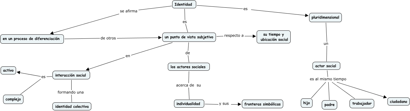 Este Cmap, tiene información relacionada con: Identidad, Gilberto Giménez, interacción social es complejo, un punto de vista subjetivo en interacción social, individualidad y sus fronteras simbólicas, en un proceso de diferenciación de otros un punto de vista subjetivo, interacción social formando una identidad colectiva, actor social es al mismo tiempo hijo, actor social es al mismo tiempo padre, Identidad es pluridimensional, interacción social es activo, Identidad es un punto de vista subjetivo, pluridimensional un actor social, actor social es al mismo tiempo trabajador, un punto de vista subjetivo de los actores sociales, los actores sociales acerca de su individualidad, un punto de vista subjetivo respecto a su tiempo y ubicación social, actor social es al mismo tiempo ciudadano, Identidad se afirma en un proceso de diferenciación