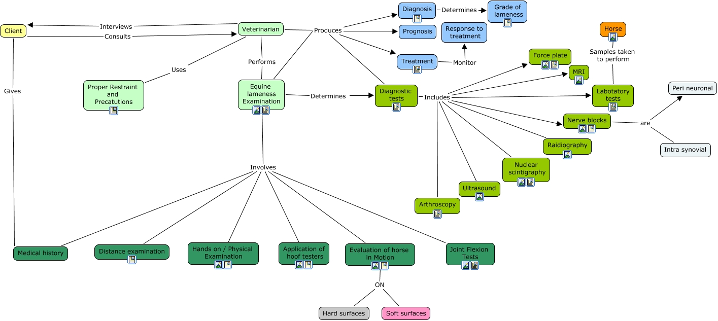 This Concept Map, created with IHMC CmapTools, has information related to: Lameness examination.cmap, Diagnostic tests Includes Force plate, Equine lameness Examination Produces Diagnosis, Evaluation of horse in Motion ON Soft surfaces, Equine lameness Examination Involves Distance examination, Treatment Monitor Response to treatment, Equine lameness Examination Determines Diagnostic tests, Veterinarian Uses Proper Restraint and Precatutions, Equine lameness Examination Involves Application of hoof testers, Equine lameness Examination Produces Prognosis, Diagnostic tests Produces Diagnosis, Veterinarian Produces Diagnosis, Client Consults Veterinarian, Veterinarian Produces Treatment, Diagnostic tests Includes Nerve blocks, Equine lameness Examination Involves Medical history, Diagnostic tests Includes Labotatory tests, Diagnostic tests Produces Prognosis, Diagnosis Determines Grade of lameness, Nerve blocks are Peri neuronal, Diagnostic tests Includes Raidiography