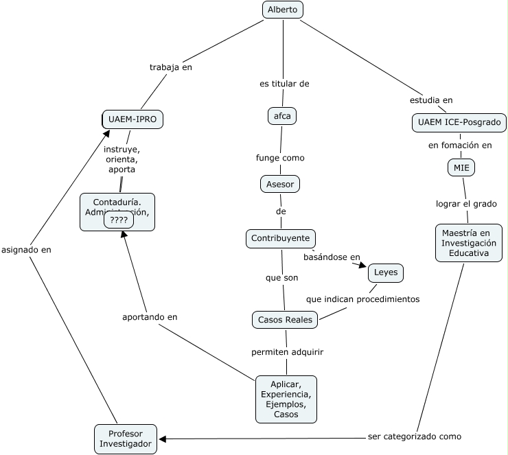 Este Cmap, tiene información relacionada con: Mapa AAA, Alberto trabaja en UAEM-IPRO, Maestría en Investigación Educativa ser categorizado como Profesor Investigador, UAEM-IPRO instruye, orienta, aporta Contaduría. Administración, otras., Contribuyente que son Casos Reales, Profesor Investigador asignado en ????, Alberto estudia en UAEM ICE-Posgrado, Casos Reales permiten adquirir Aplicar, Experiencia, Ejemplos, Casos, UAEM ICE-Posgrado en fomación en MIE, Alberto es titular de afca, afca funge como Asesor, Contribuyente basándose en Leyes, Aplicar, Experiencia, Ejemplos, Casos aportando en ????, MIE lograr el grado Maestría en Investigación Educativa, Asesor de Contribuyente, Leyes que indican procedimientos Casos Reales