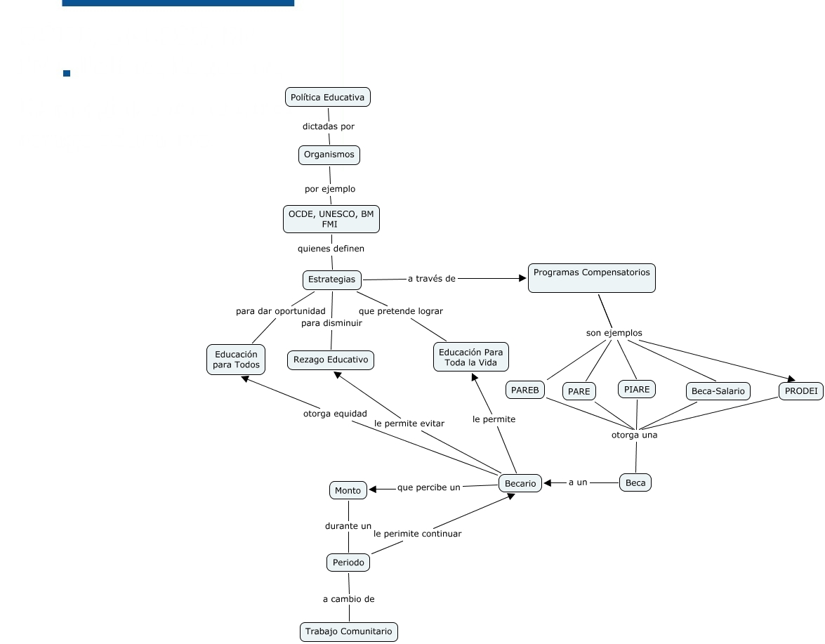 Este Cmap, tiene información relacionada con: Mconceptos10ix13, Becario le permite evitar Rezago Educativo, Programas Compensatorios son ejemplos PRODEI, Programas Compensatorios son ejemplos Beca-Salario, Monto durante un Periodo, Programas Compensatorios son ejemplos PARE, Programas Compensatorios son ejemplos PARE, PARE otorga una Beca, Programas Compensatorios son ejemplos Beca-Salario, Becario otorga equidad Educación para Todos, Organismos por ejemplo OCDE, UNESCO, BM FMI, Programas Compensatorios son ejemplos PRODEI, Periodo a cambio de Trabajo Comunitario, Programas Compensatorios son ejemplos PIARE, Becario le permite Educación Para Toda la Vida, Becario que percibe un Monto, Estrategias para dar oportunidad Educación para Todos, Estrategias que pretende lograr Educación Para Toda la Vida, Programas Compensatorios son ejemplos PIARE, Periodo le perimite continuar Becario, Programas Compensatorios son ejemplos PAREB